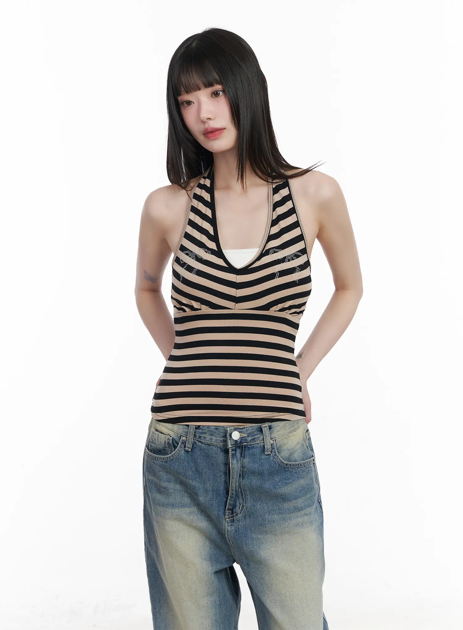 Bow Embellished Stripe Padded Halter Top CM524