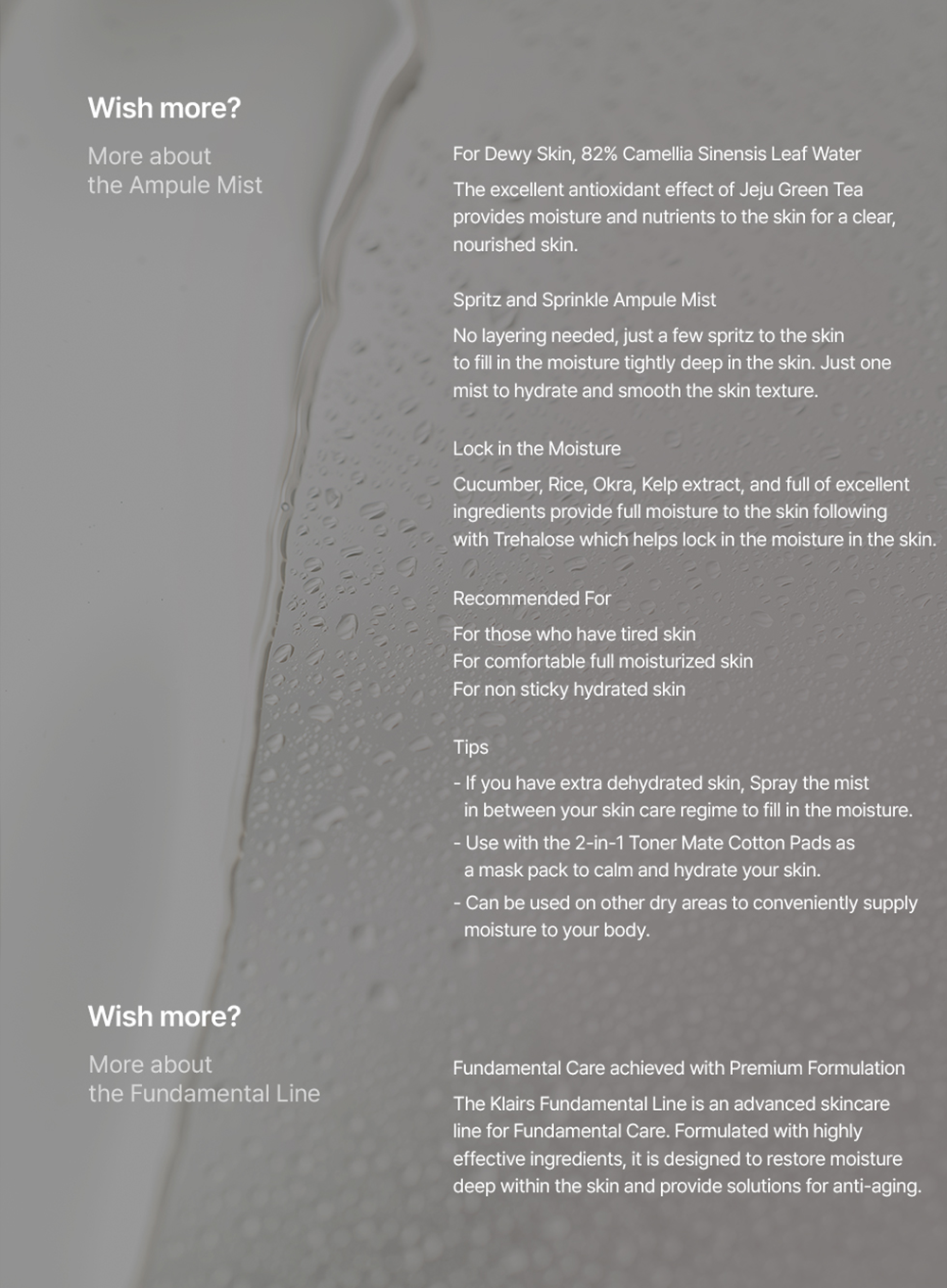 Ampule mist infused with green tea, luffa, and okra extracts to hydrate and revitalize the skin.