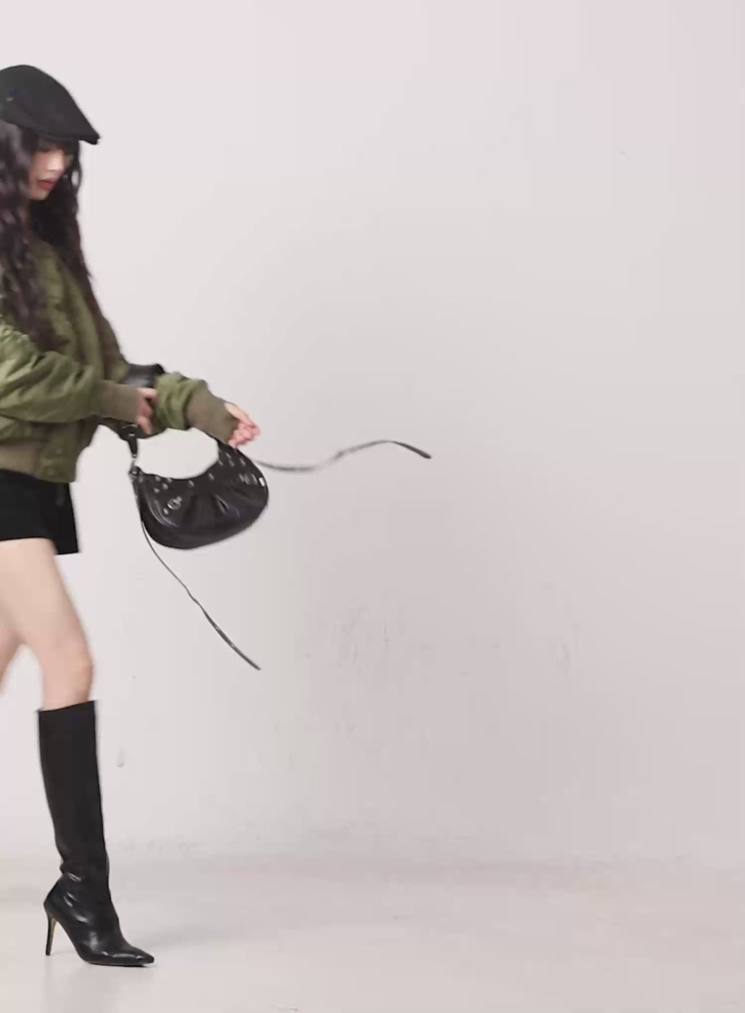 A cropped black bomber jacket, faux leather shorts, and sleek ankle boots combine to form a powerful statement look. Paired with ski poles and a bold attitude, this outfit brings a cyberpunk-inspired twist to traditional winterwear. Designed for those who embrace individuality, it’s the perfect choice for making a locked eyes on the slopes or beyond.