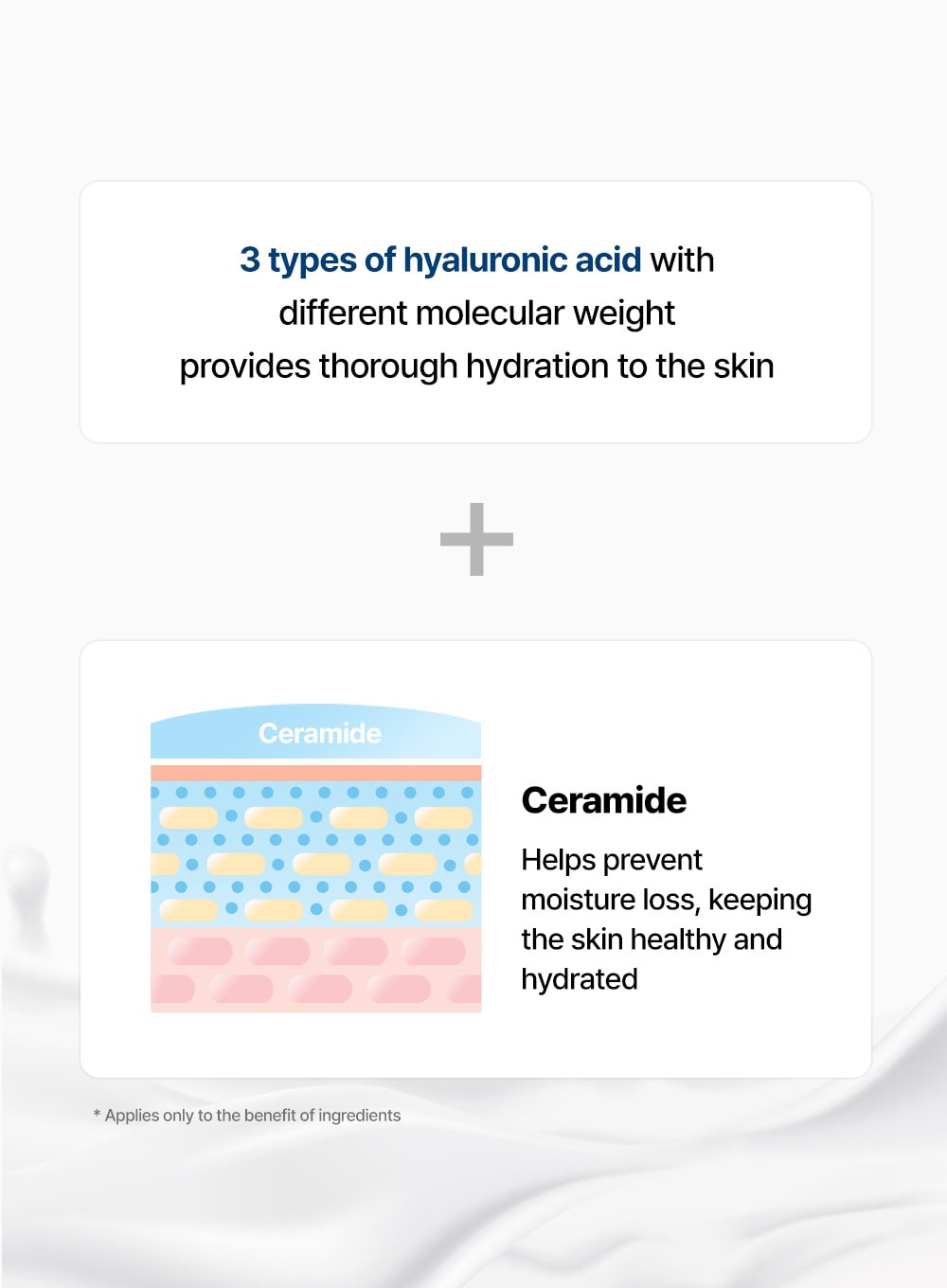 • Triple-layered hyaluronic acid deeply hydrates the skin, keeping it moisturized for longer.