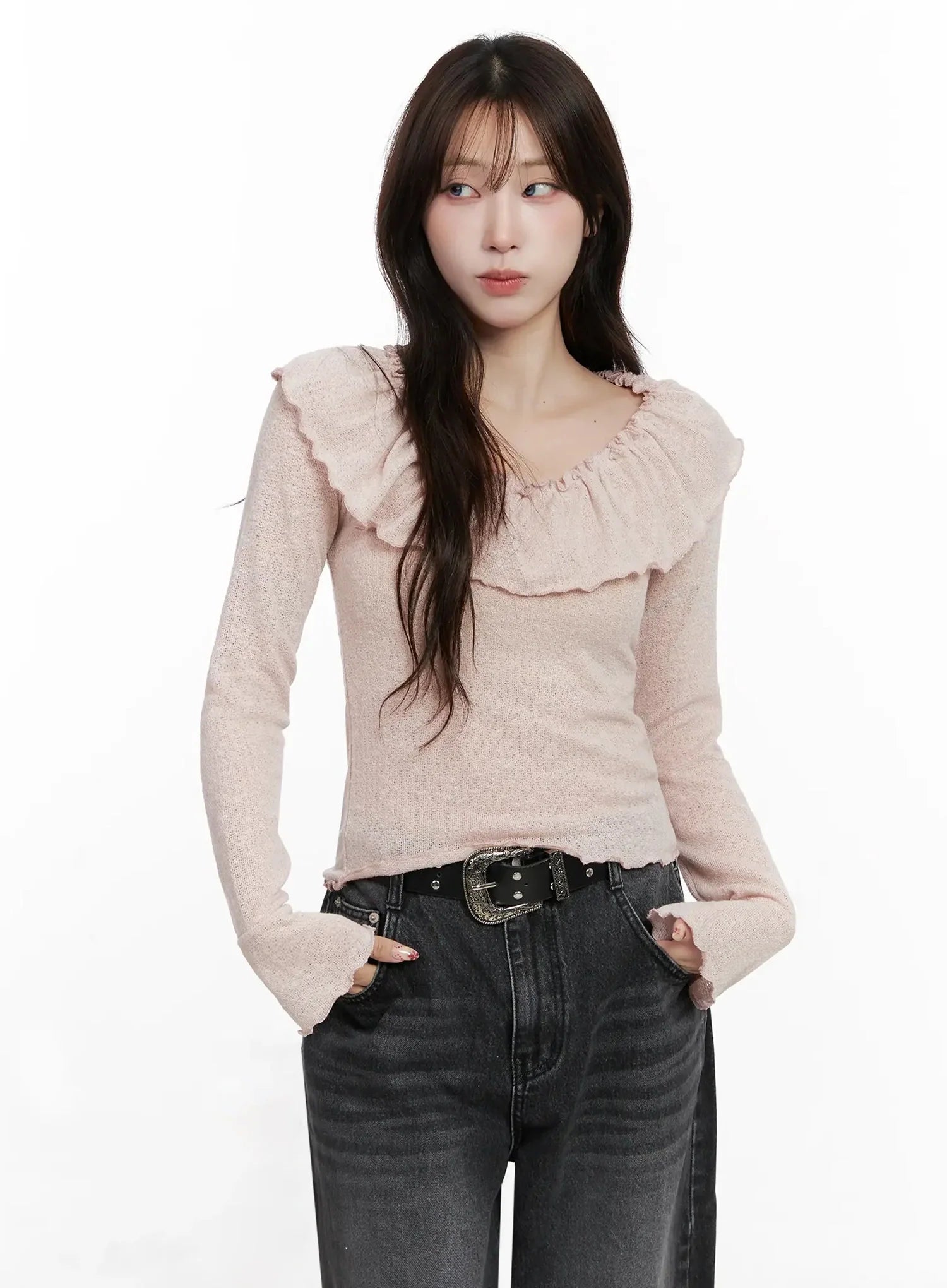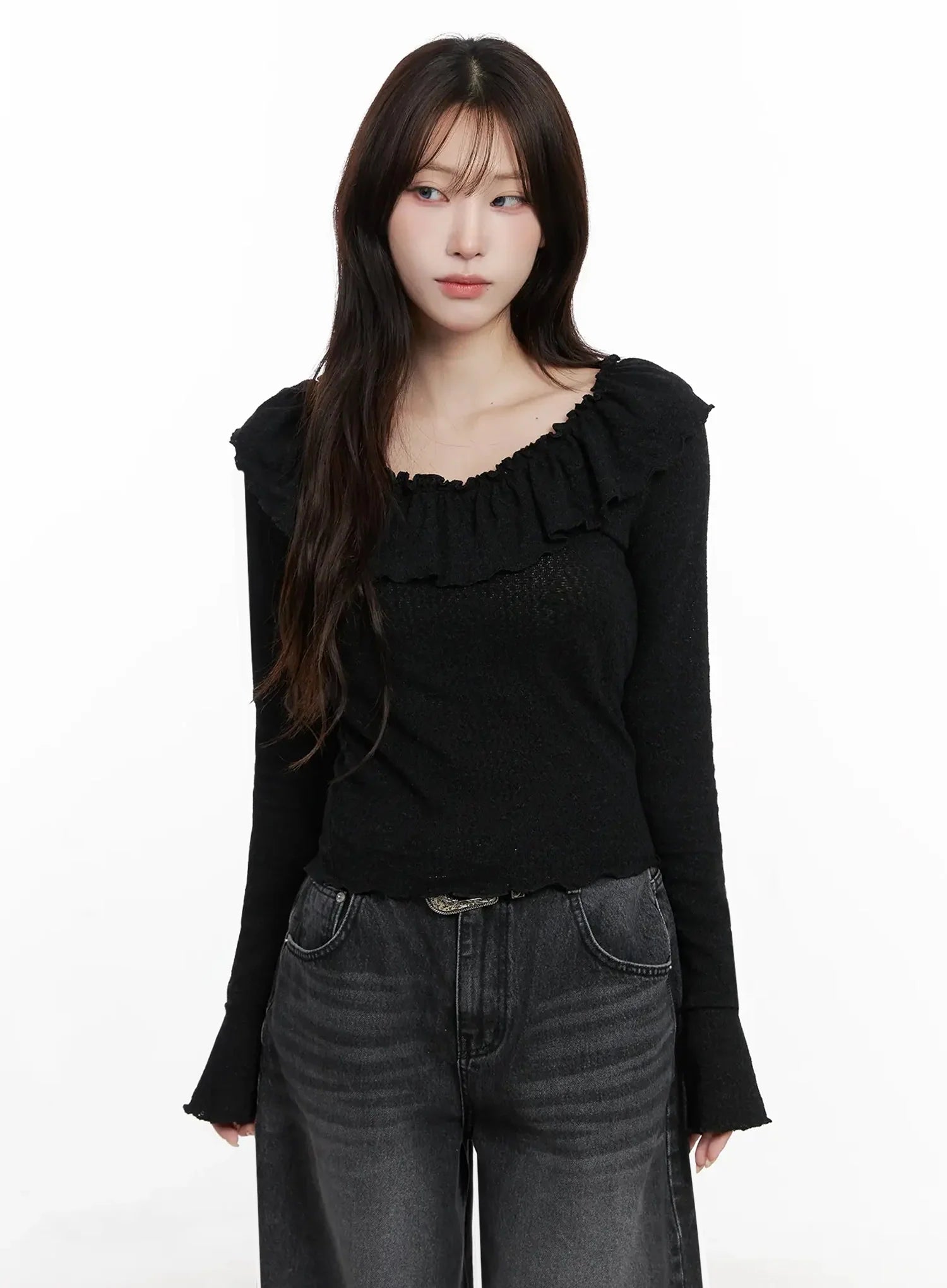 Frilled Off-Shoulder Long Sleeve Top IN514