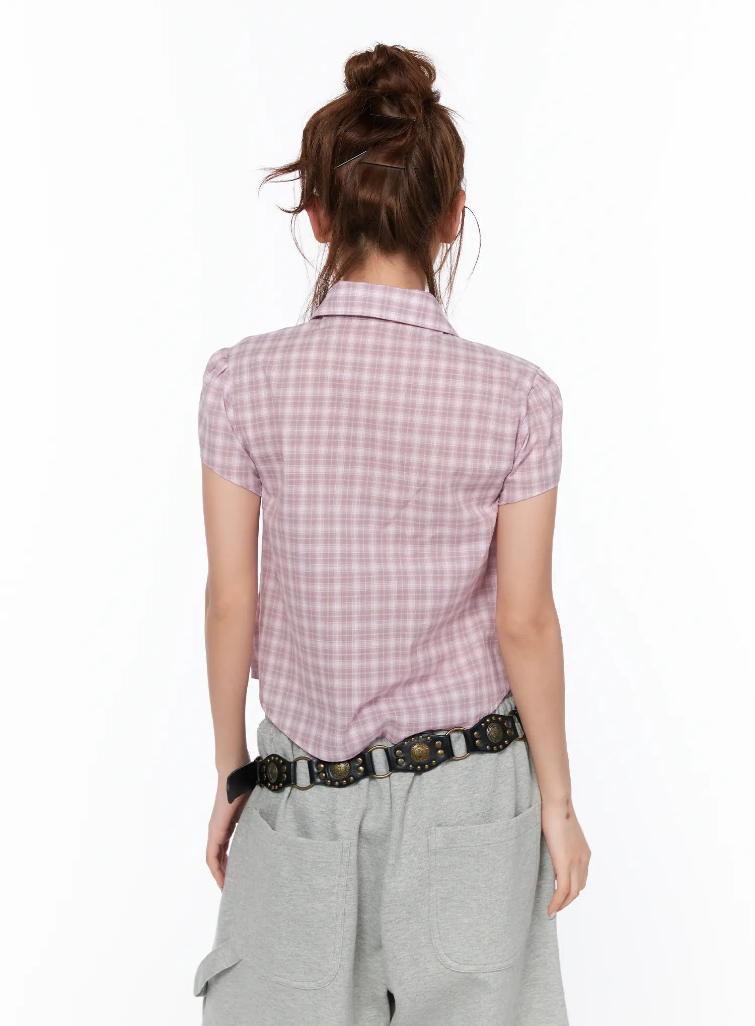 Plaid Shirred Short Sleeve Shirt CA515