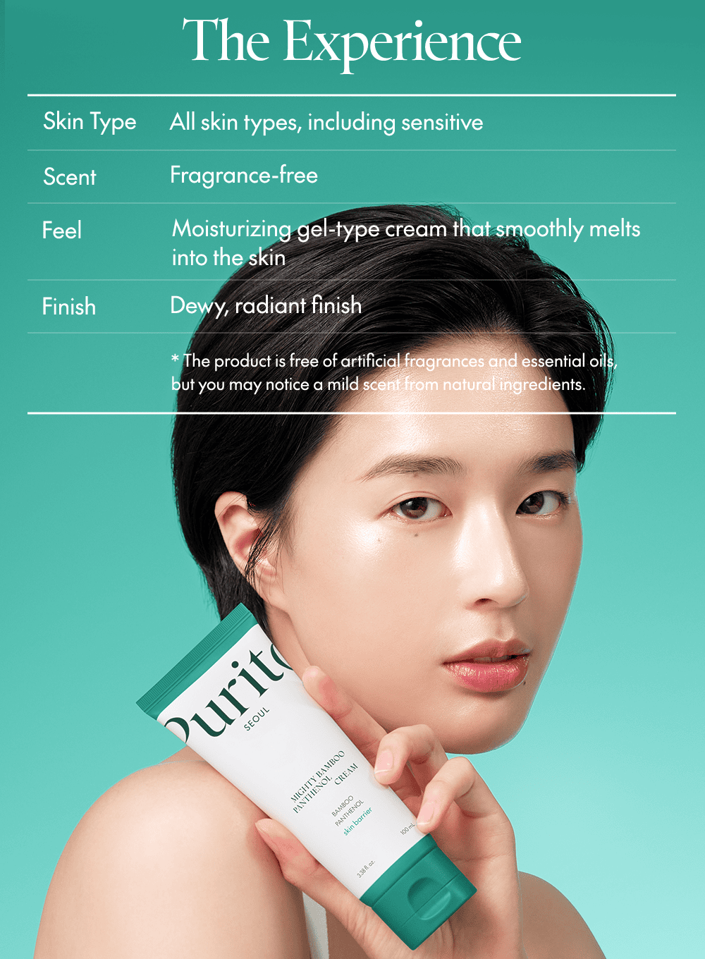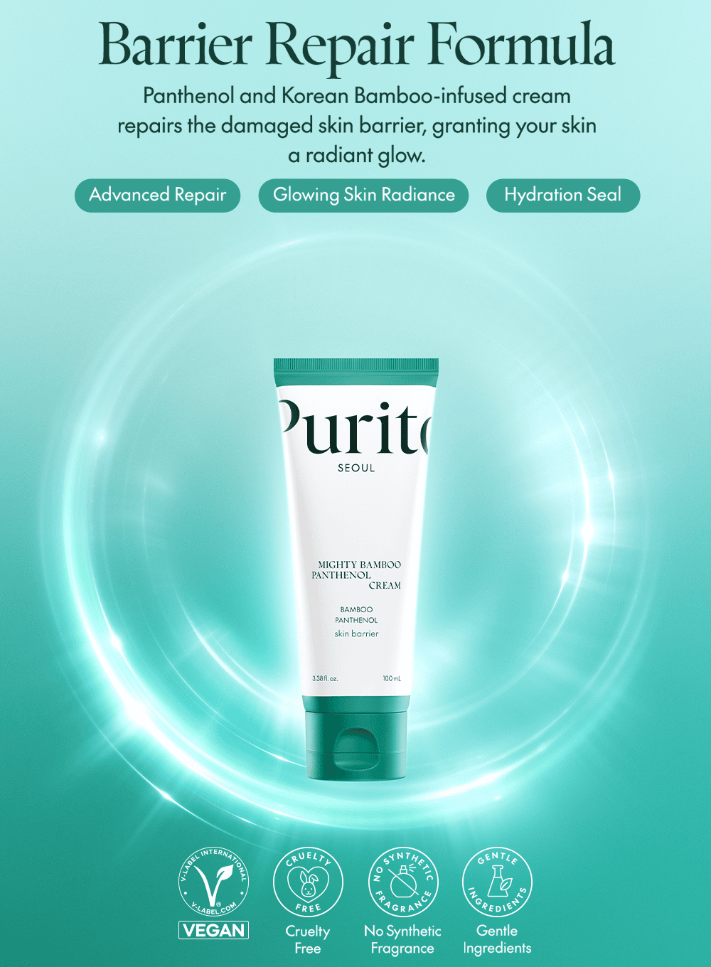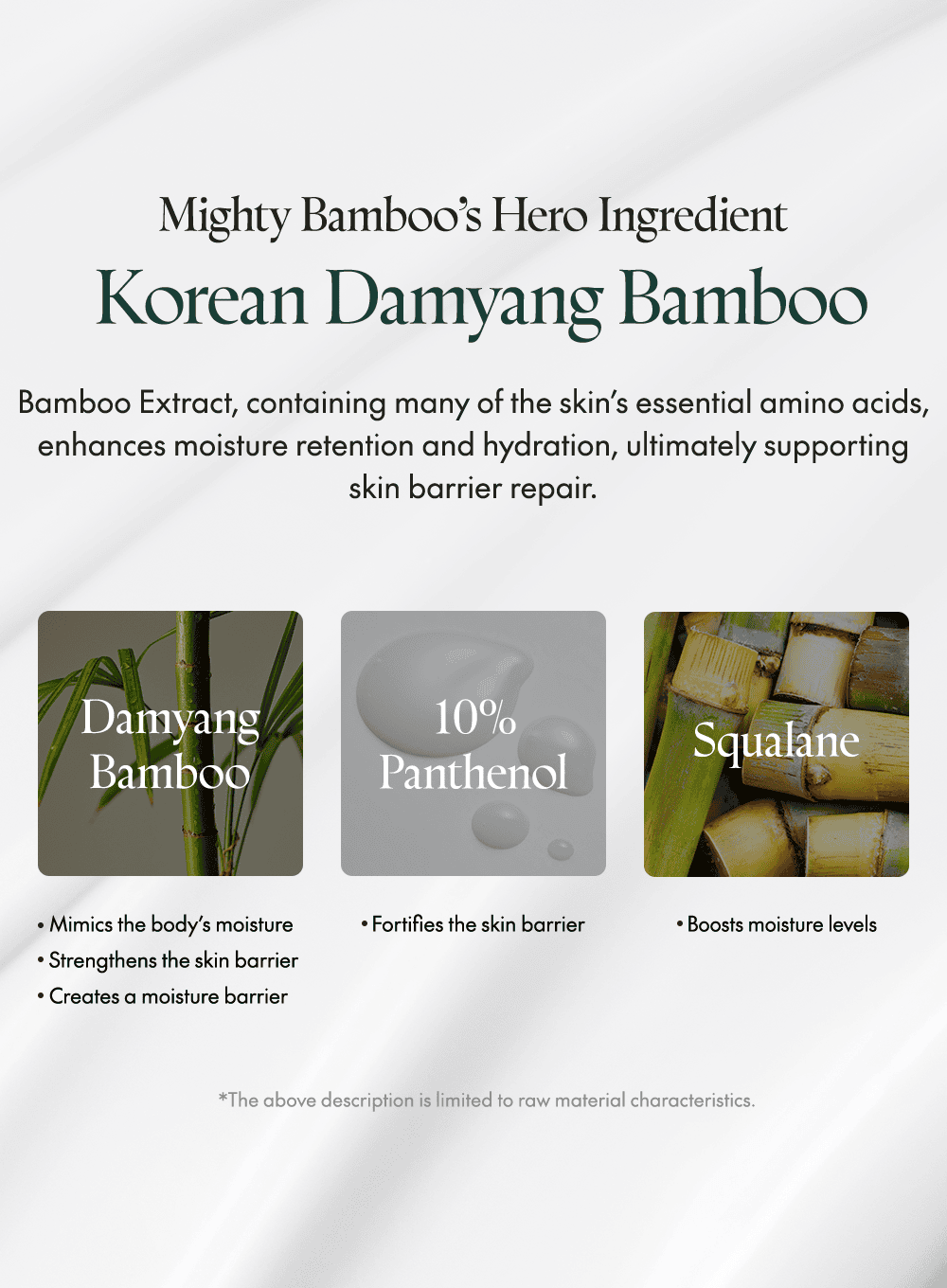 Panthenol and Korean Bamboo-infused cream repairs the damaged skin barrier, granting your skin a radiant glow.
