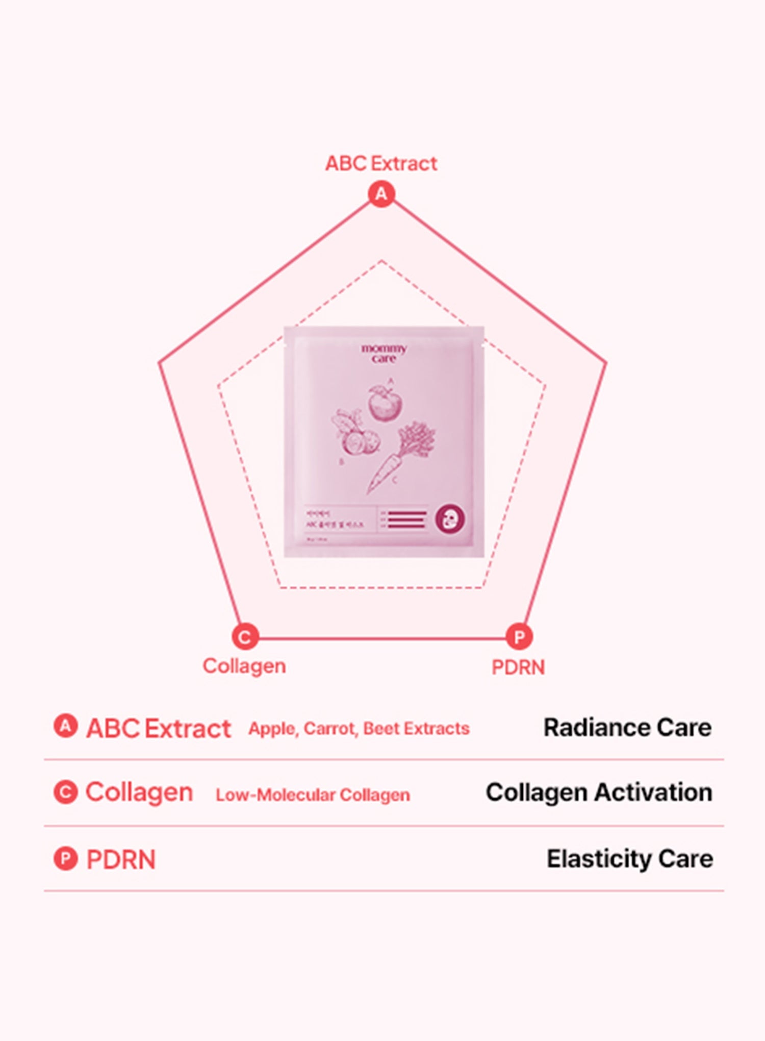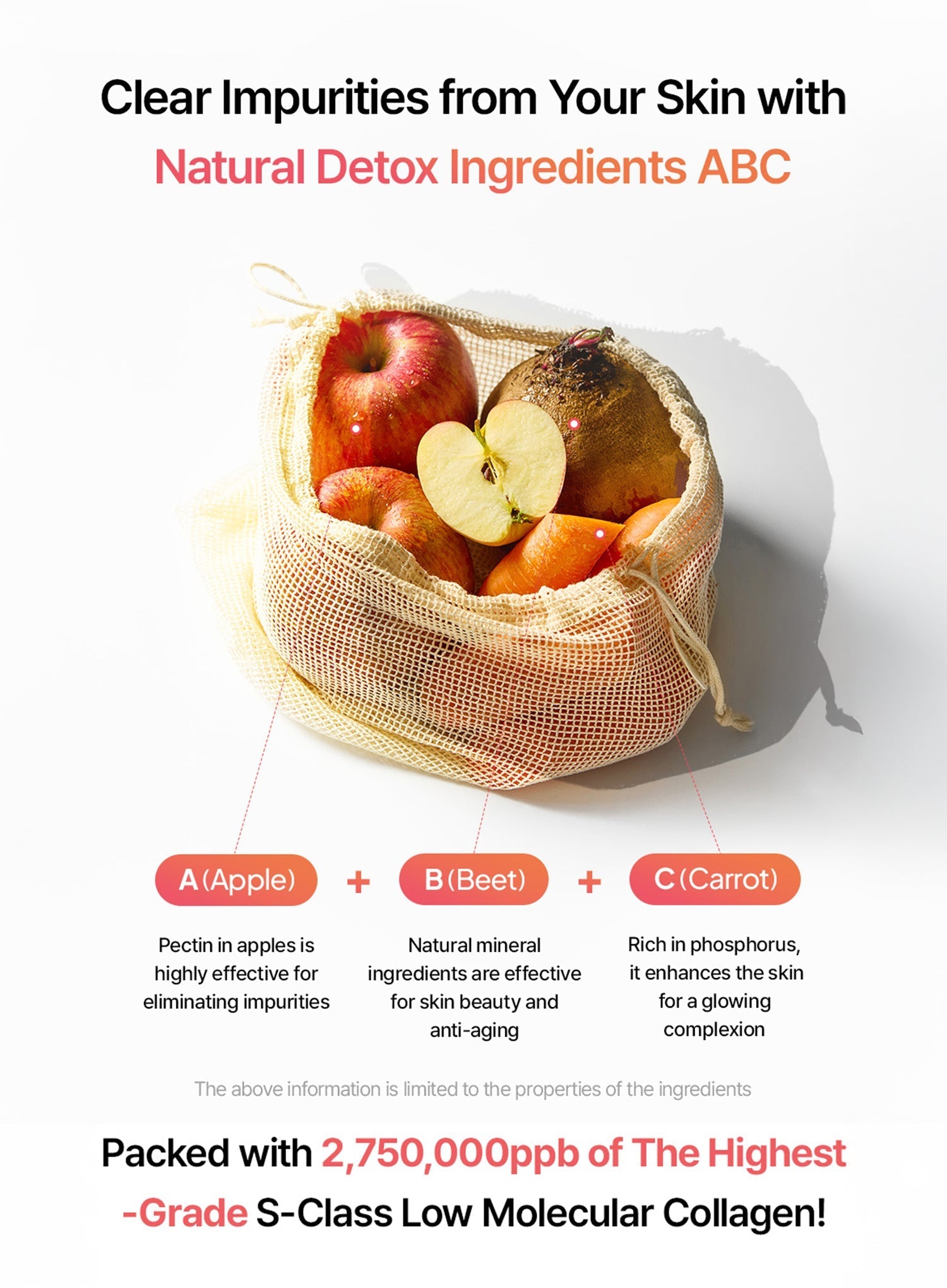 Water, Acrylates Copolymer, 1,2-Hexanediol, Glycerin, Dipropylene Glycol, Niacinamide, Methylpropanediol, Chondrus Crispus Powder, Betaine, Ceratonia Siliqua (Carob) Gum, Sucrose, Hydroxyacetophenone, Collagen, Panthenol, Allantoin, Potassium Chloride, Algin, Glucomannan, Xanthan Gum, Cyamopsis Tetragonoloba (Guar) Gum, Cellulose Gum, Adenosine, Dipotassium Glycyrrhizate, Ethylhexylglycerin, Sodium Hyaluronate, Cyanocobalamin, Retinyl Palmitate, Tocopherol, Butylene Glycol, Pyrus Malus (Apple) Fruit Extract, Daucus Carota Sativa (Carrot) Root Extract, Brassica Oleracea Acephala Leaf Extract, Beta Vulgaris (Beet) Root Extract, Centella Asiatica Extract, Sodium DNA, Brassica Oleracea Capitata (Cabbage) Leaf Extract