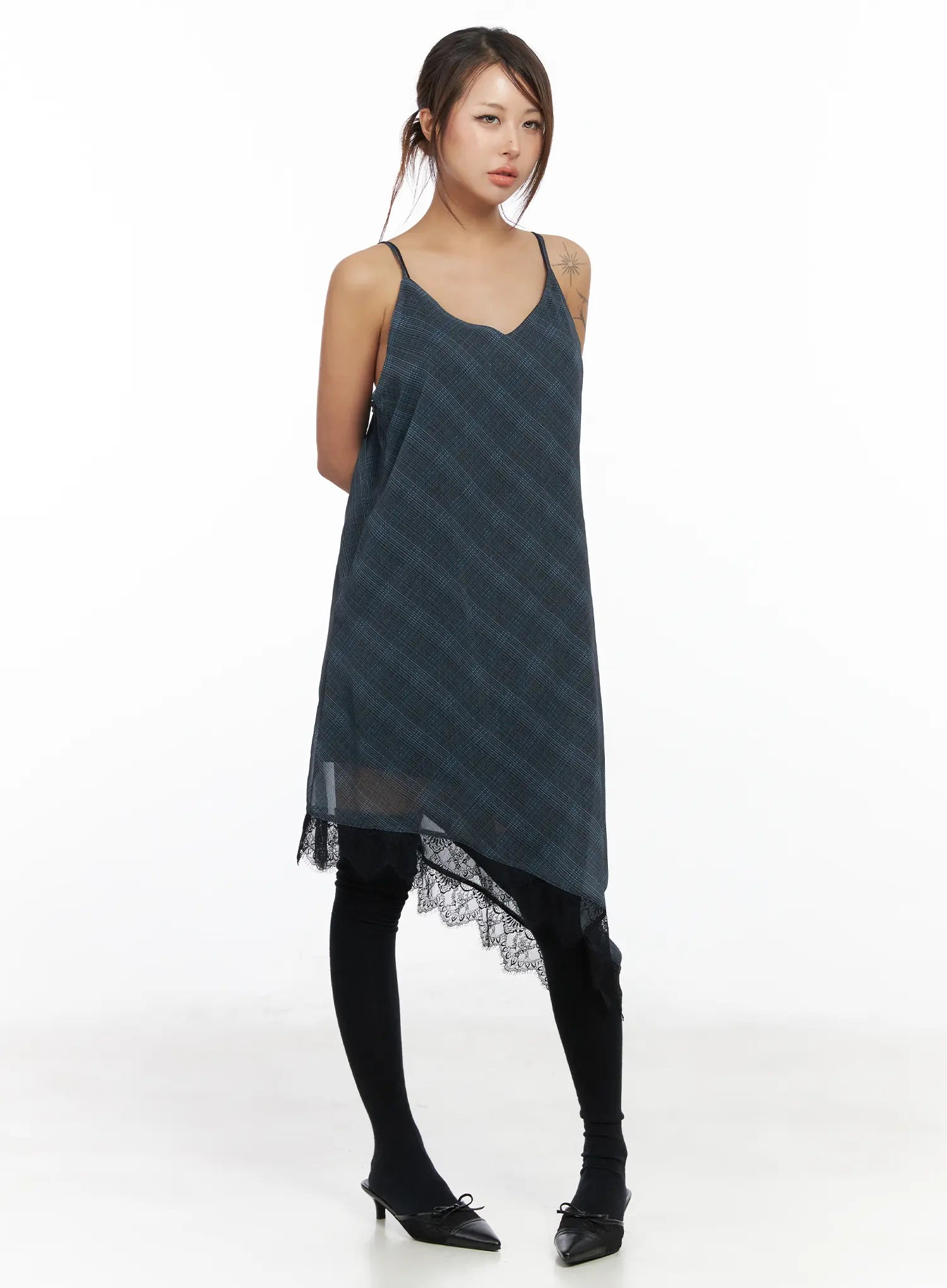 Asymmetric Lace-Trim Plaid Midi Dress CF511