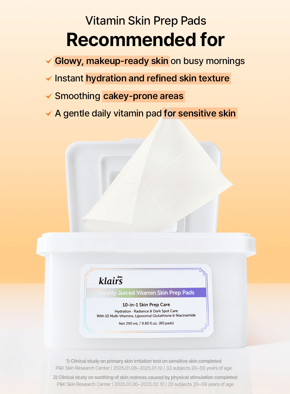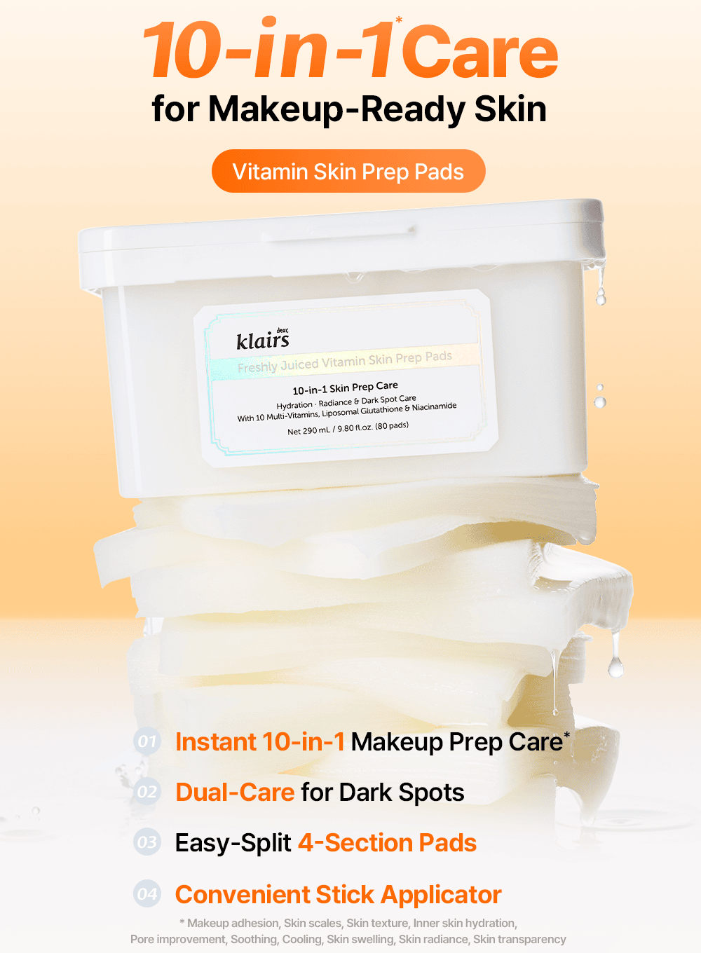 Low-irritation toner pads infused with 10 vitamins and hyaluronic acid for radiant, balanced skin.