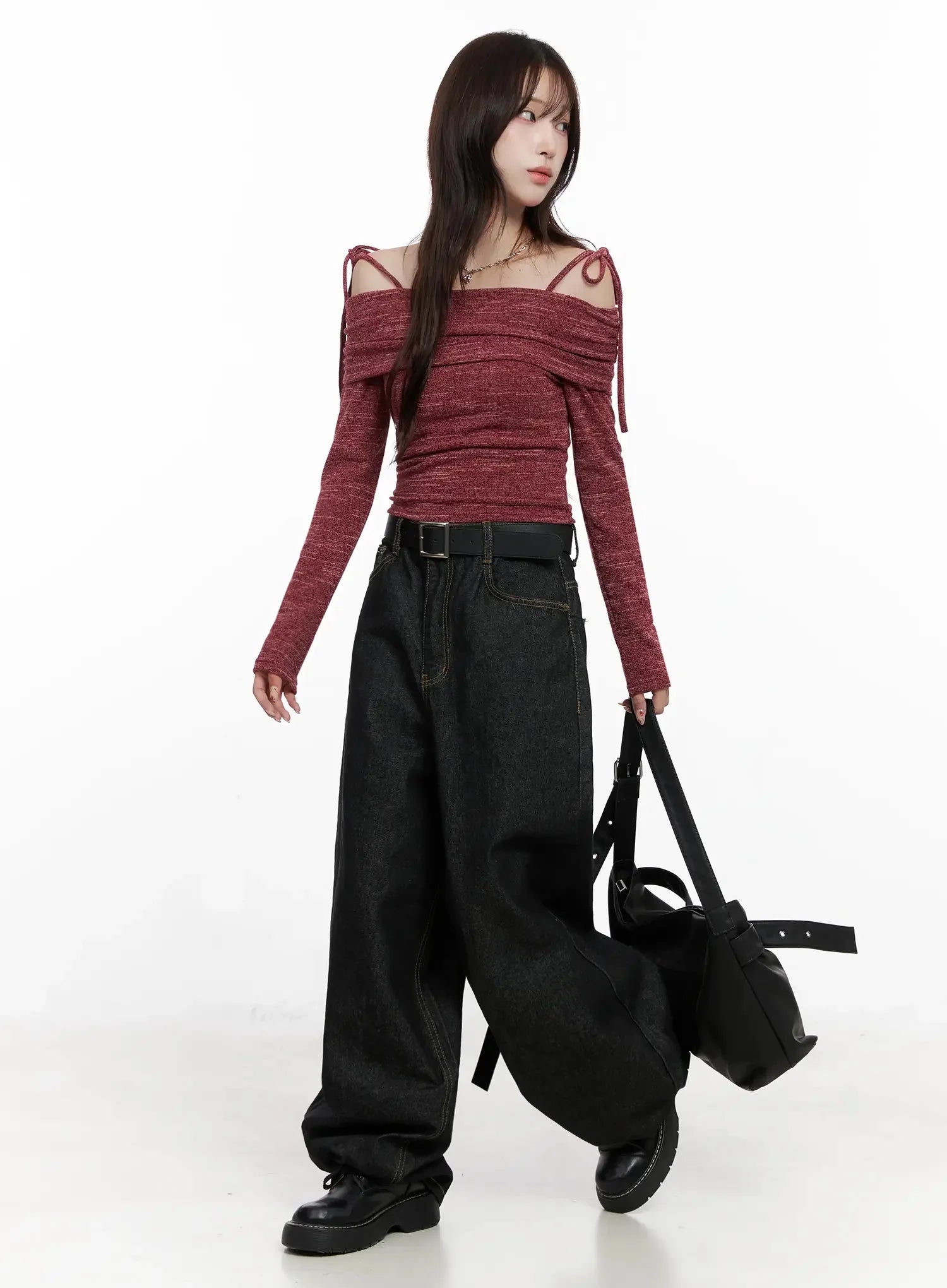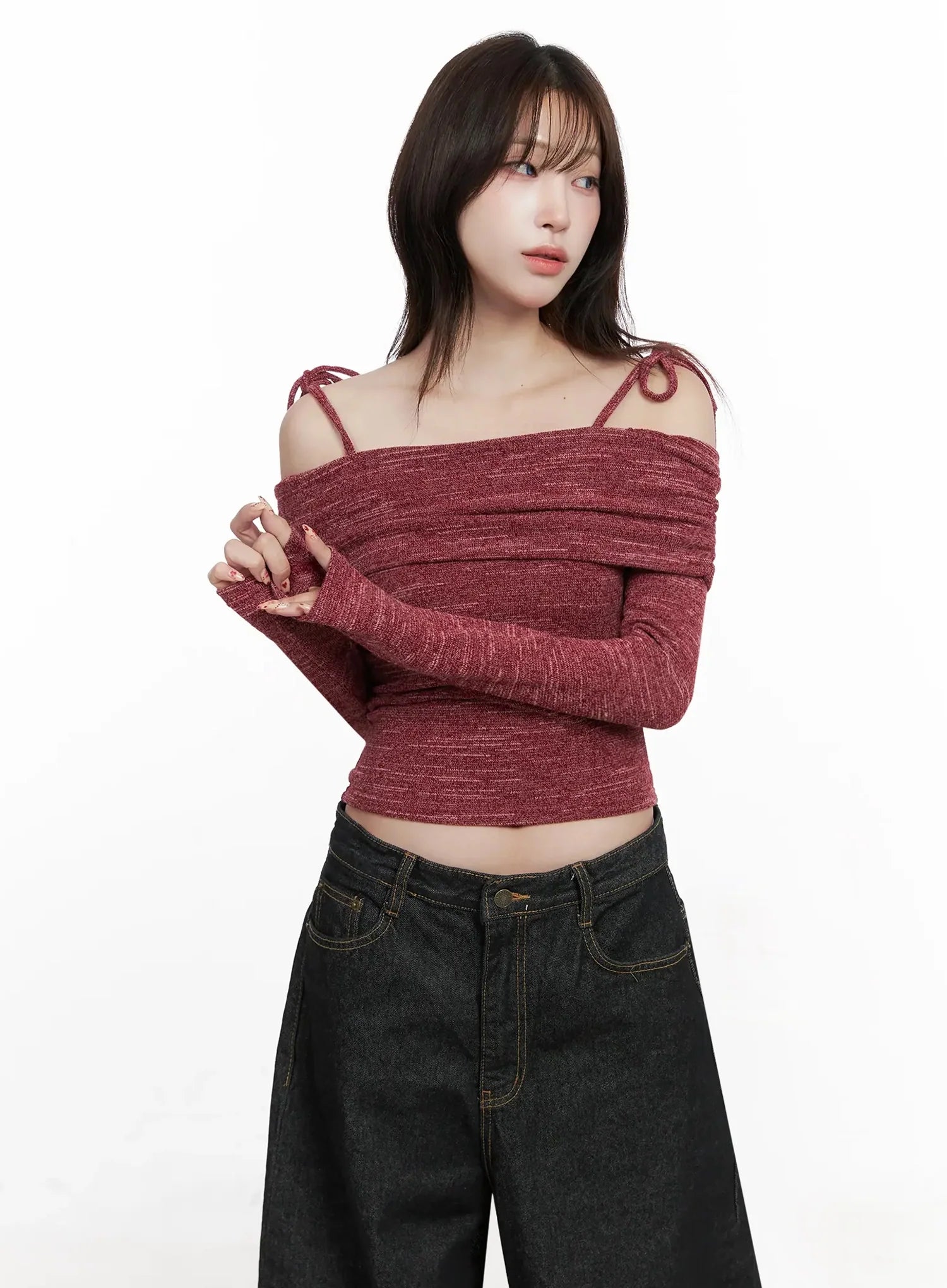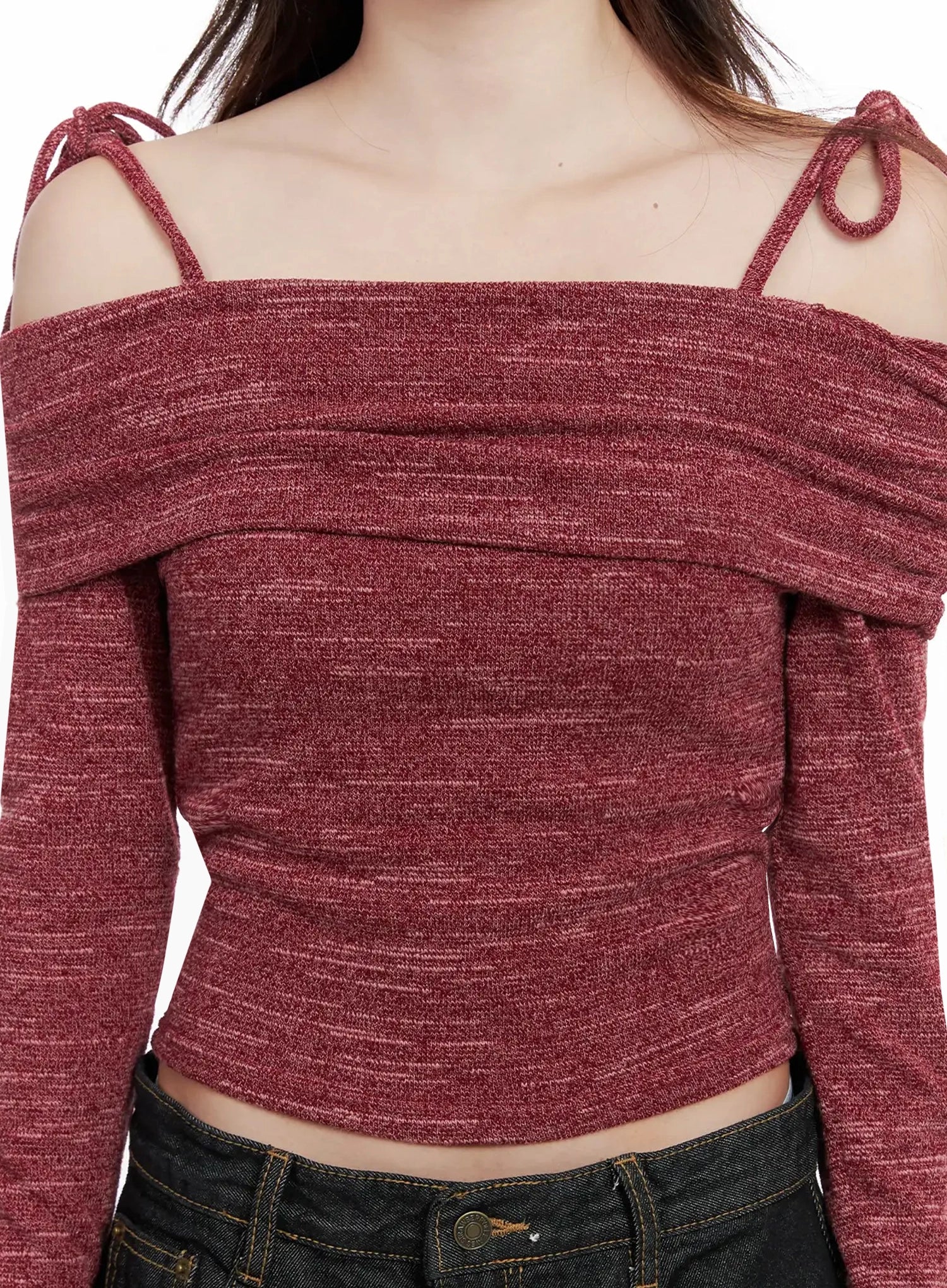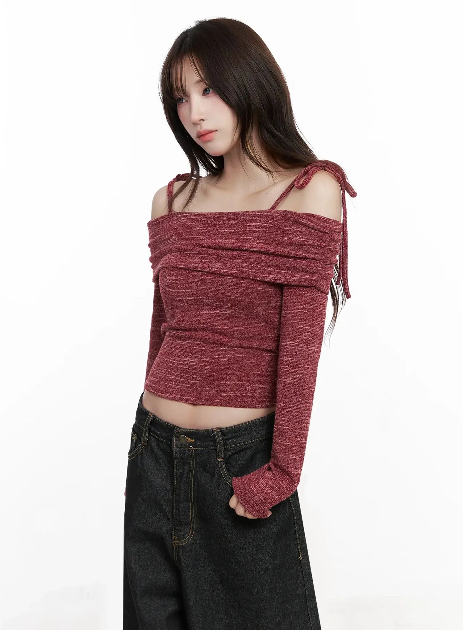 Knit Ribbon Strap Off-Shoulder Top IN514
