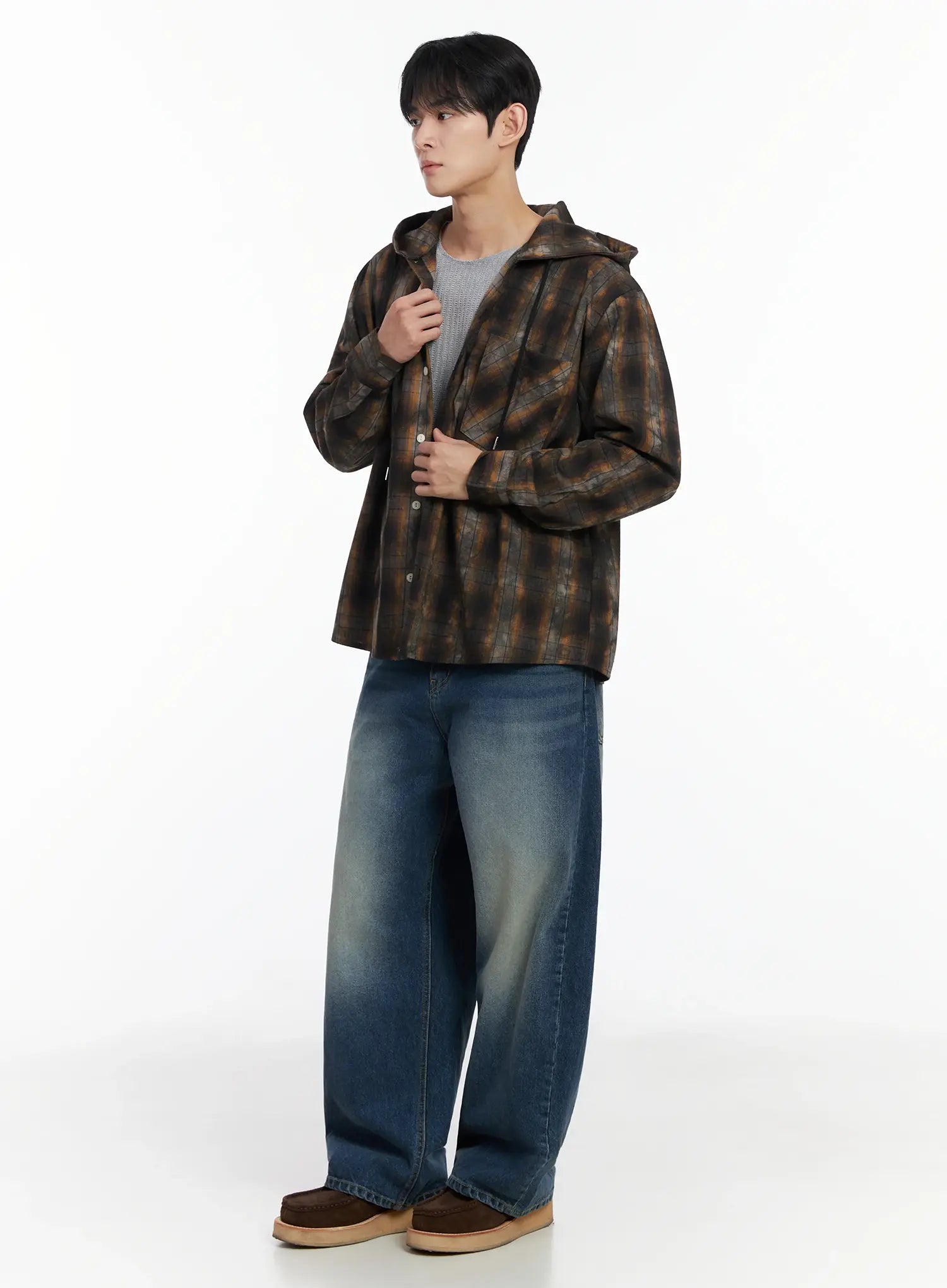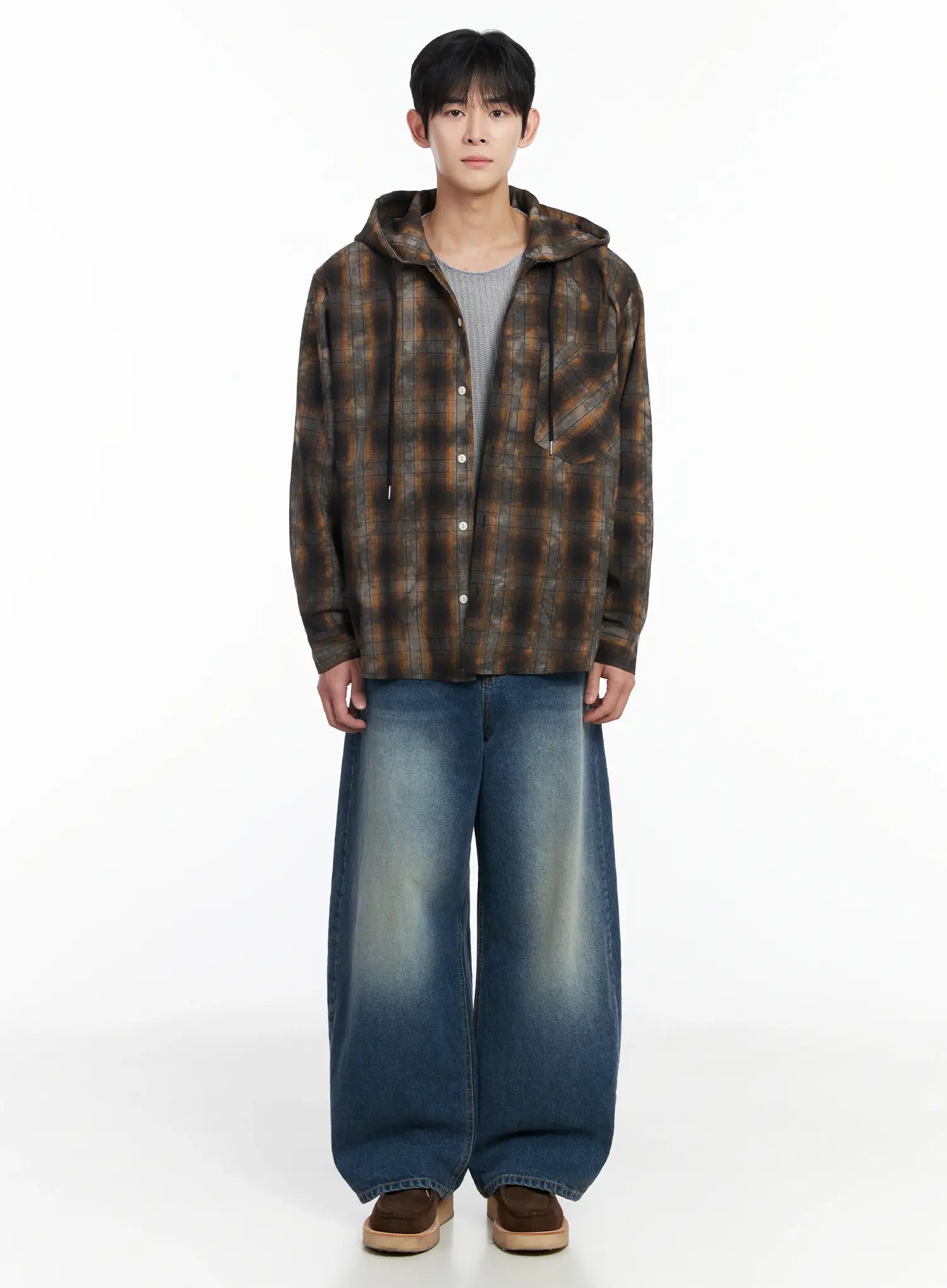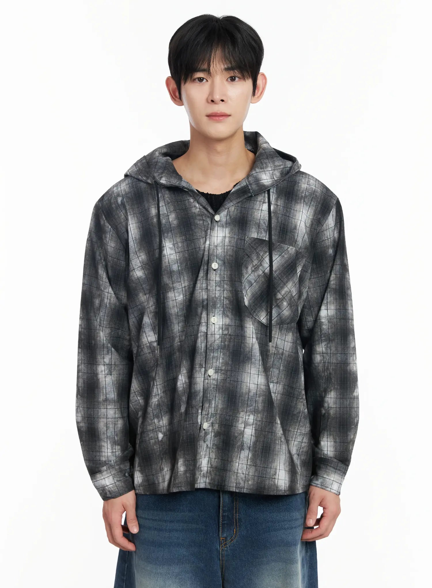 Men's Dark Wash Plaid Hooded Flannel IF516