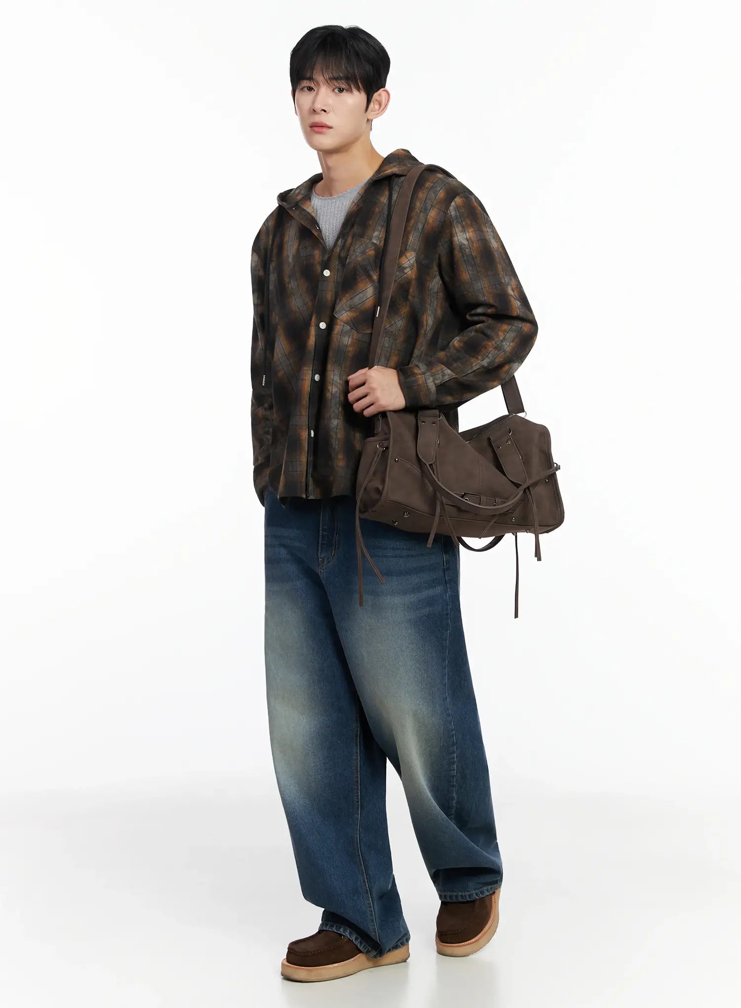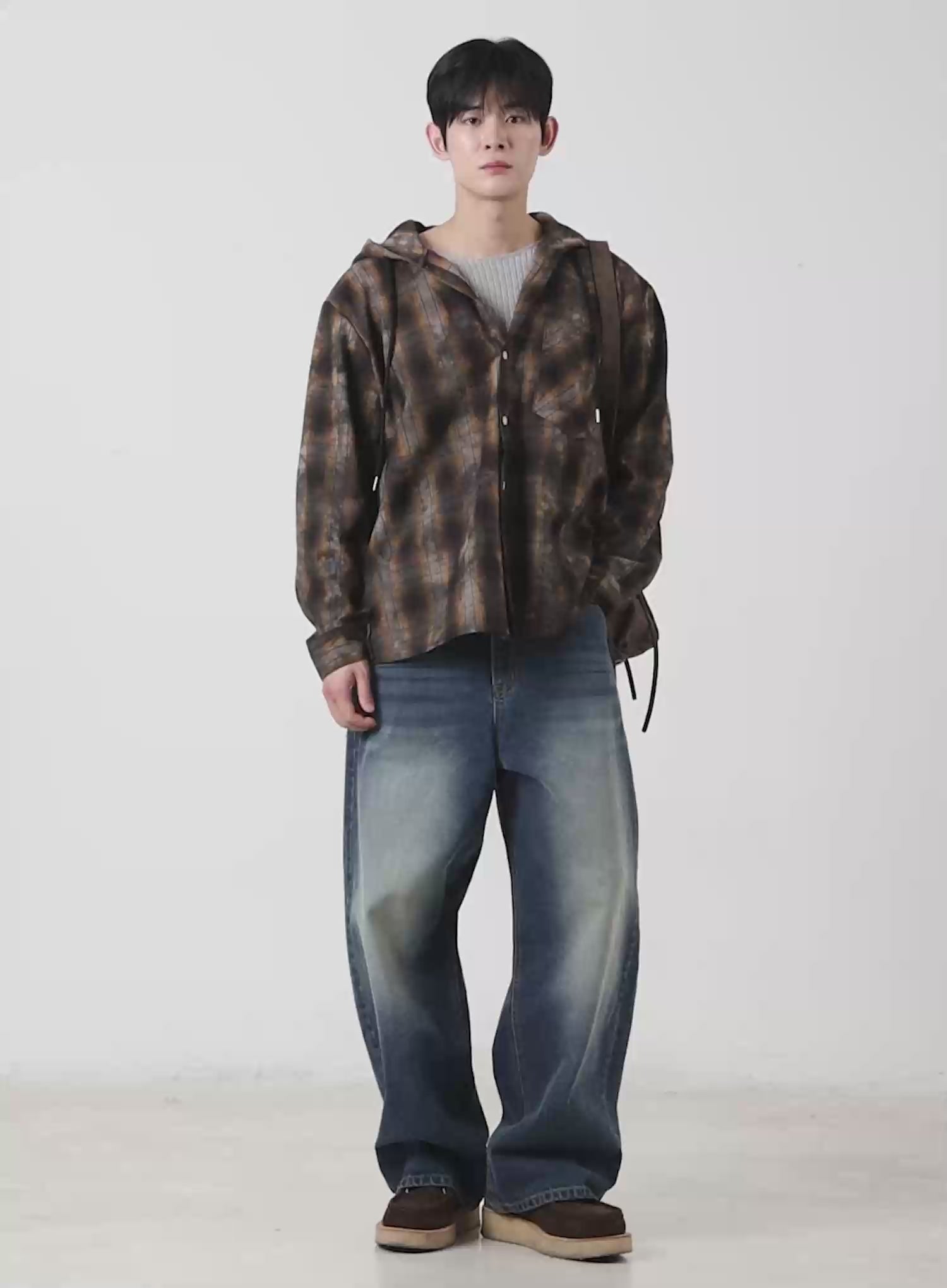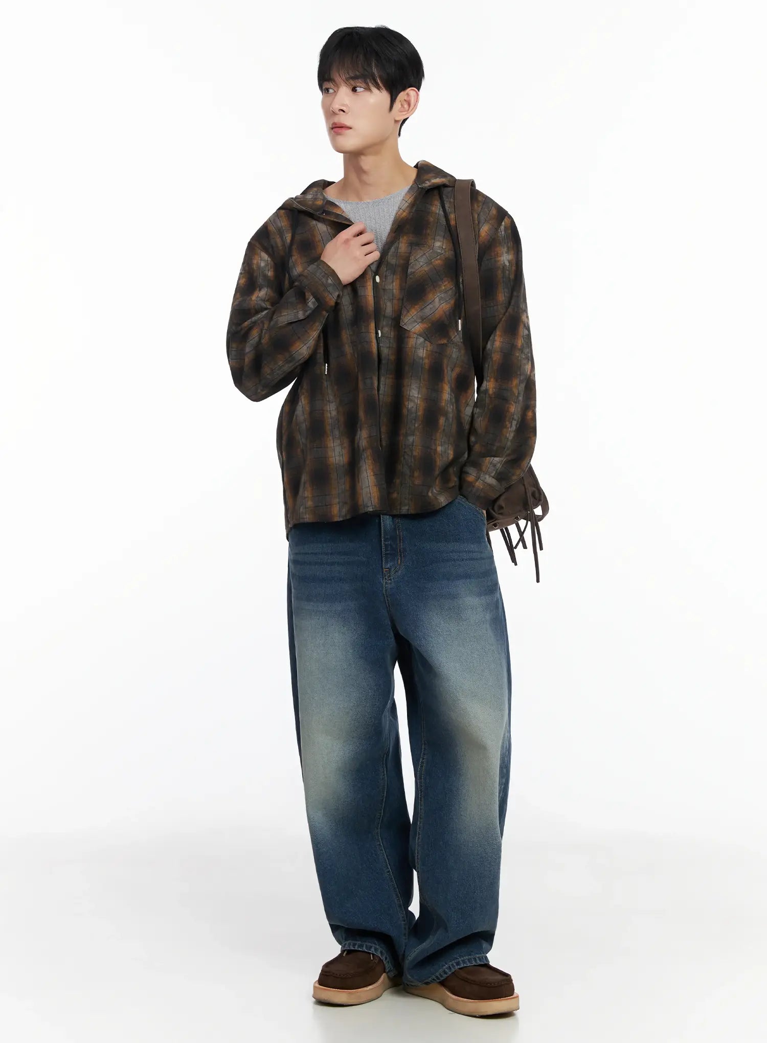 Men's Dark Wash Plaid Hooded Flannel IF516