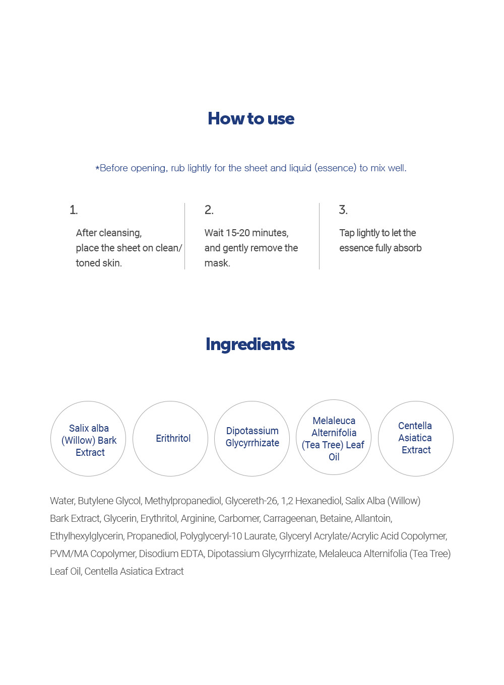 Aqua(Water), Butylene Glycol, Methylpropanediol, Glycereth-26, 1,2-Hexanediol, Salix Alba (Willow) Bark Extract, Glycerin, Erythritol, Betaine, Arginine, Carbomer, Allantoin, Ethylhexylglycerin, Polyglyceryl-10 Laurate, Propanediol, Glyceryl Acrylate/Acrylic Acid Copolymer, Carrageenan, PVM/MA Copolymer, Disodium EDTA, Dipotassium Glycyrrhizate, Centella Asiatica Extract