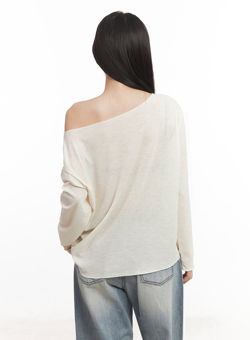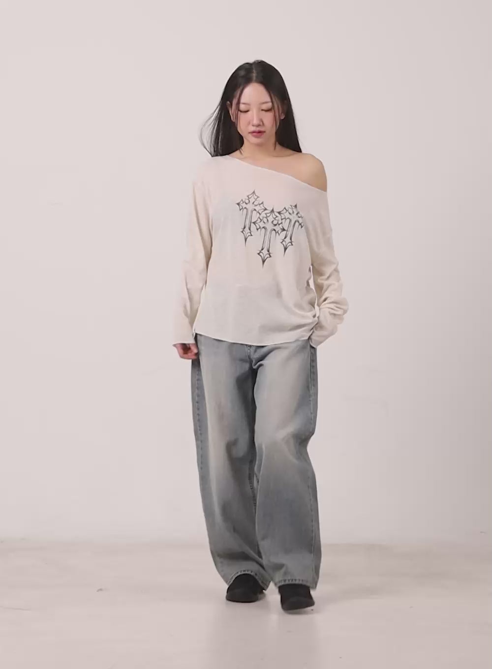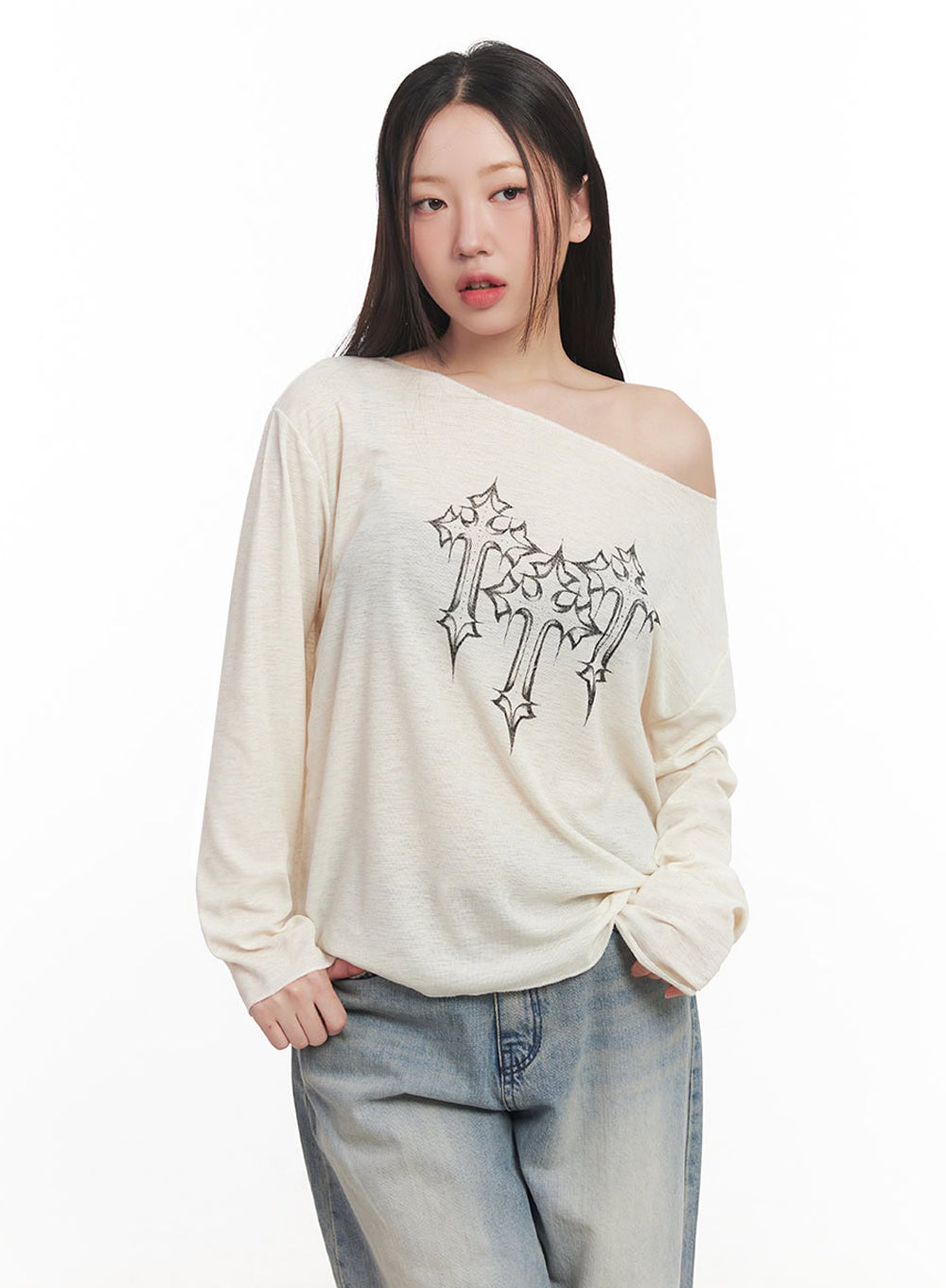 One-Shoulder Sheer Long-Sleeve Graphic Top IM528