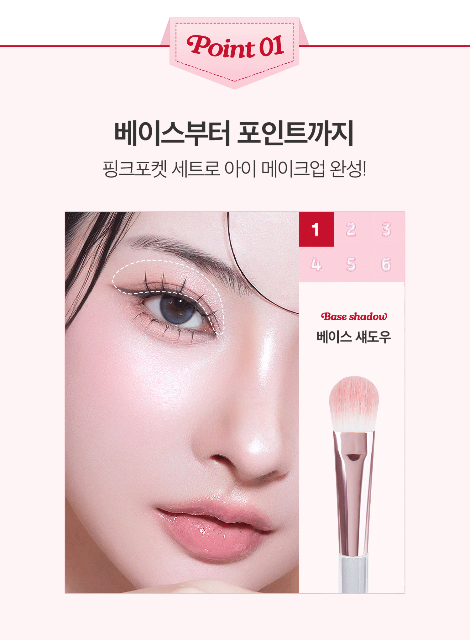 - The base shadow brush covers the entire lid evenly, while the blending and point brushes define and deepen the eyes naturally.