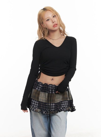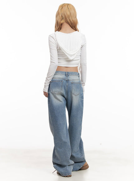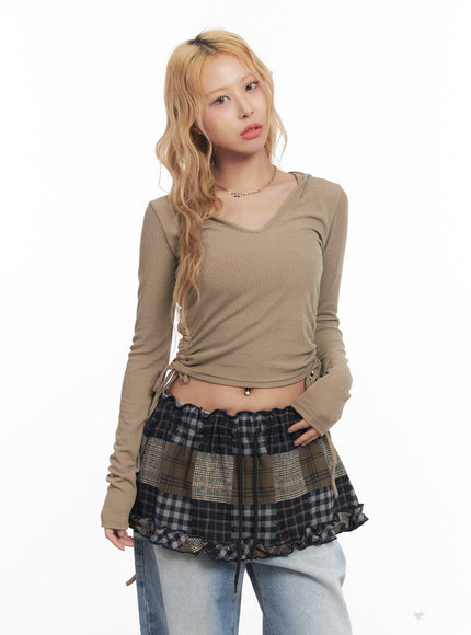 Shirred Ribbon Long-Sleeve Hooded Crop Top CM505