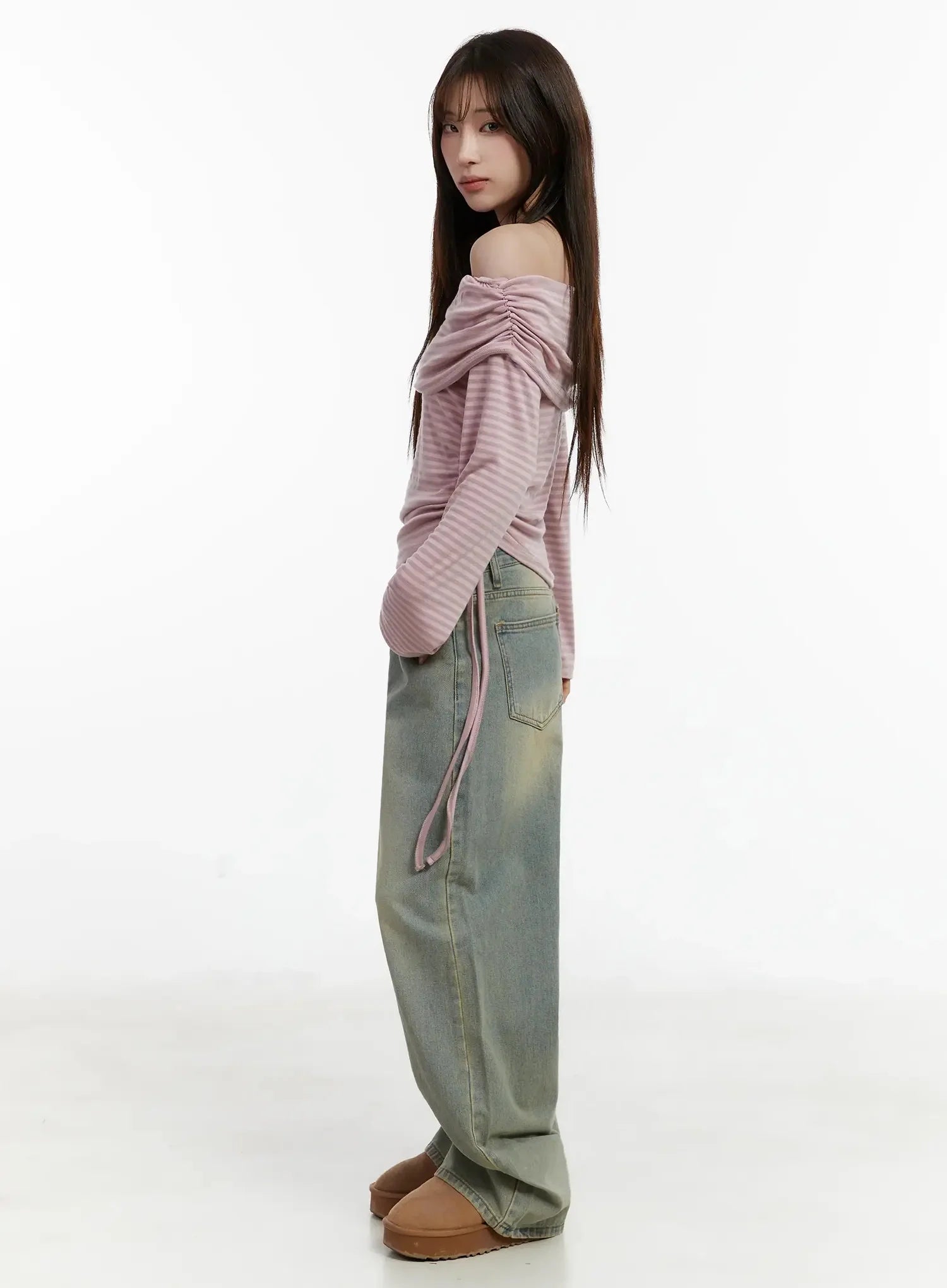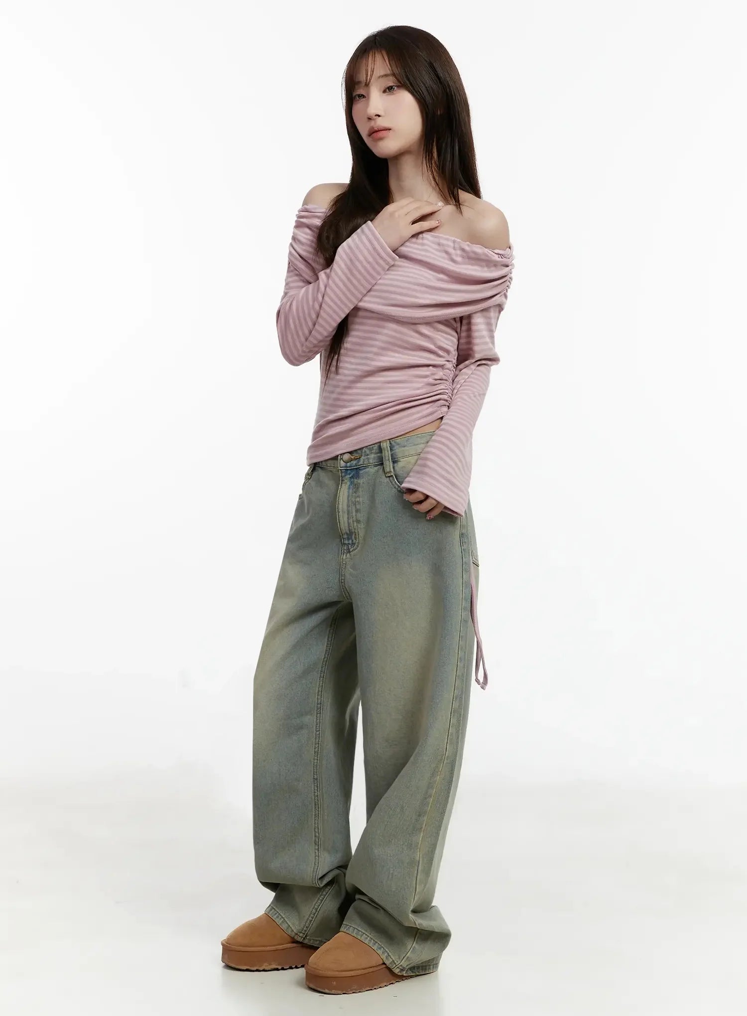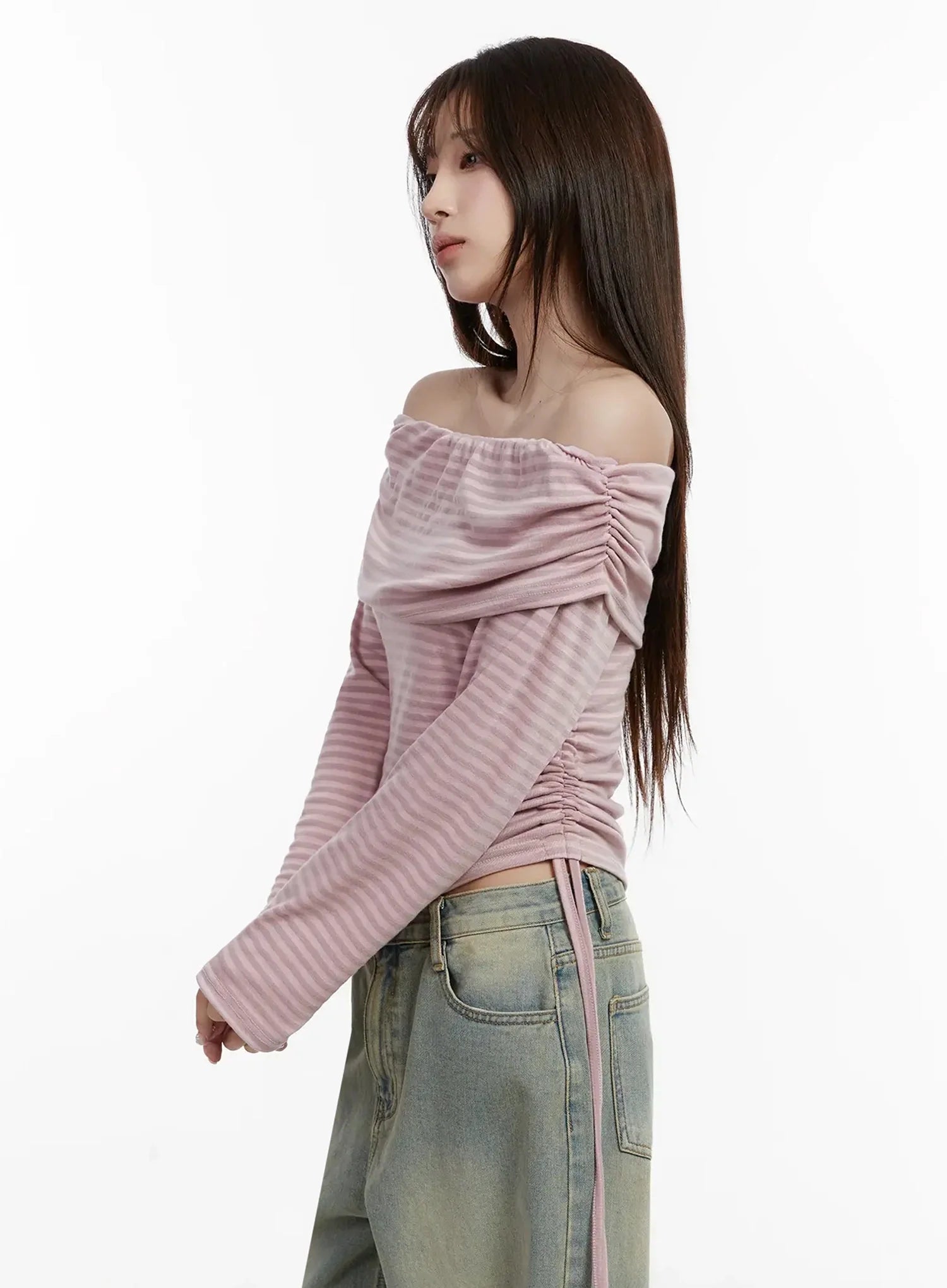 Striped Off-Shoulder Shirred Top IJ516