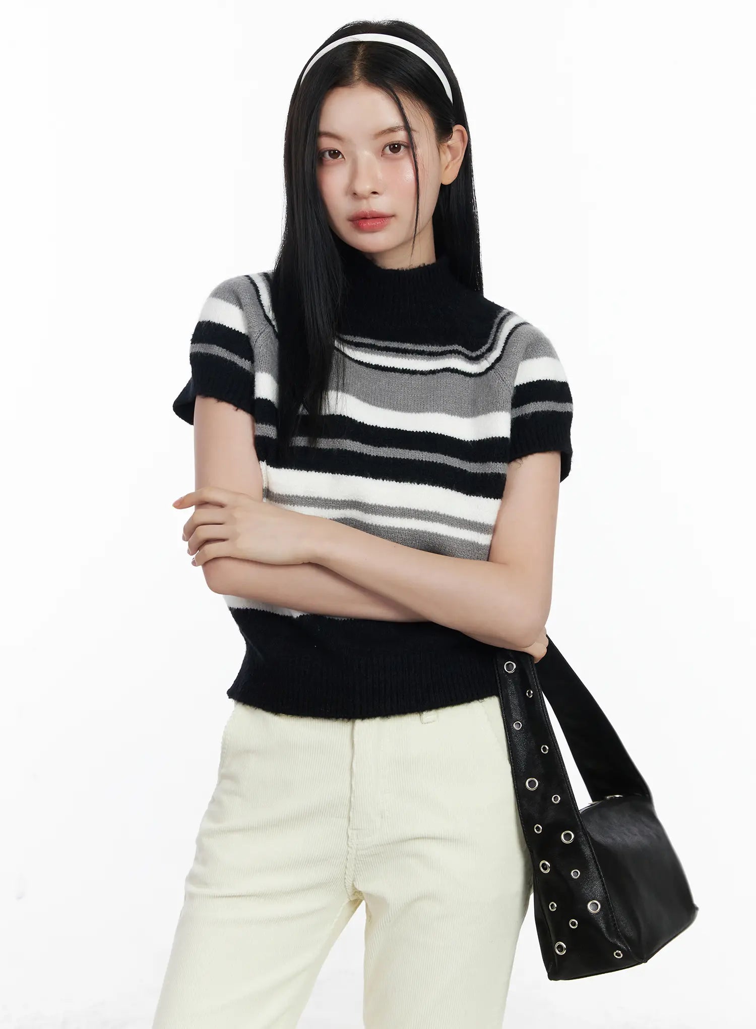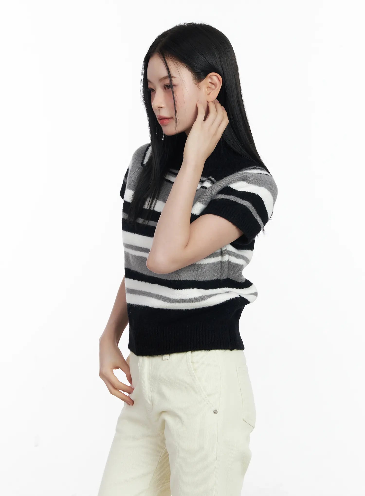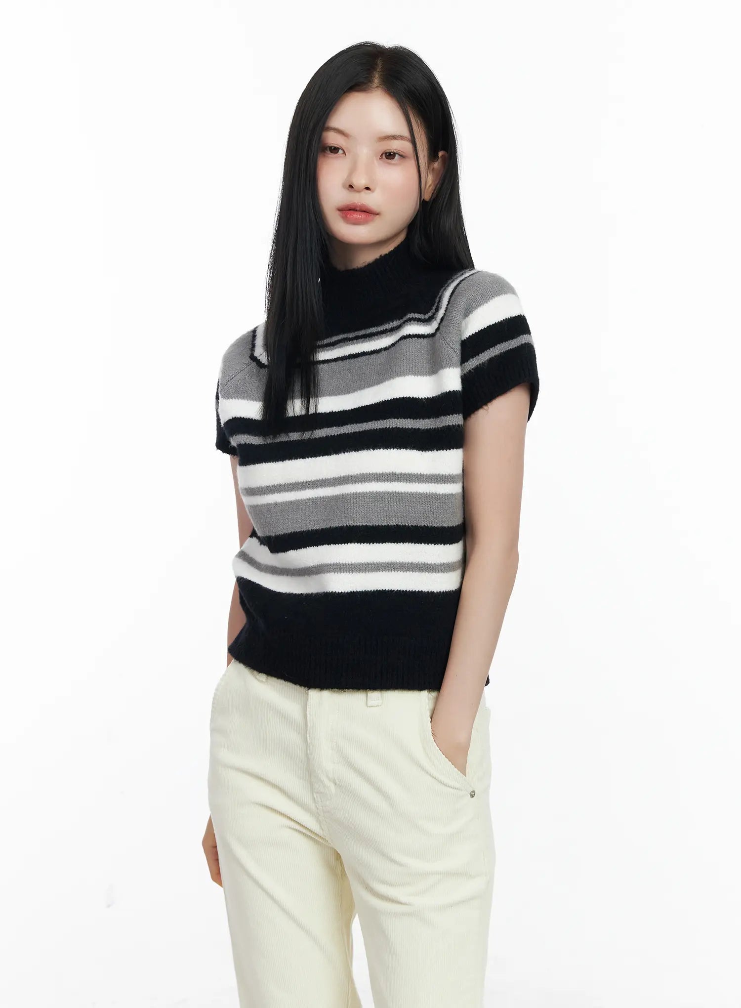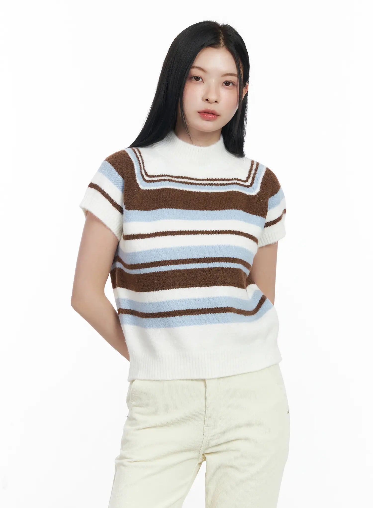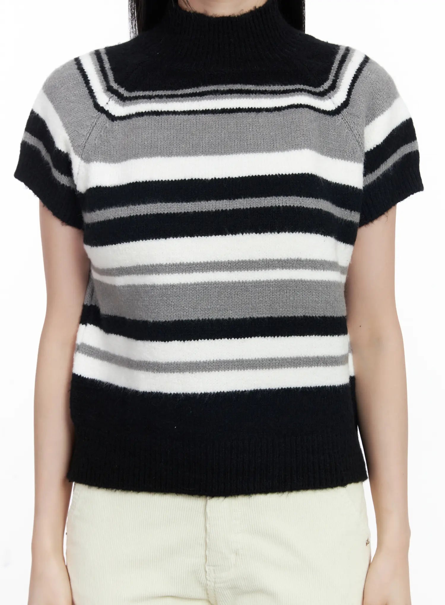 Striped Turtleneck Short Sleeve Knit Top CJ520