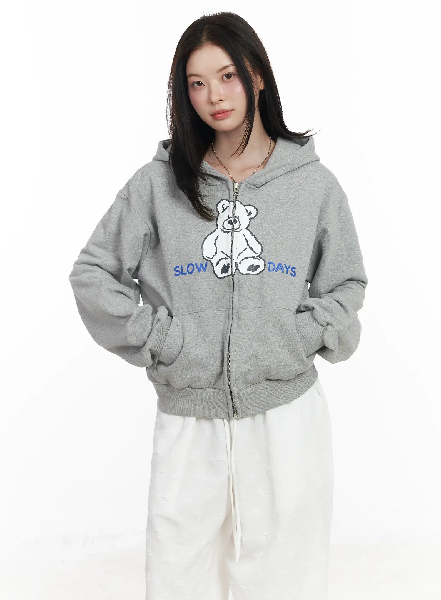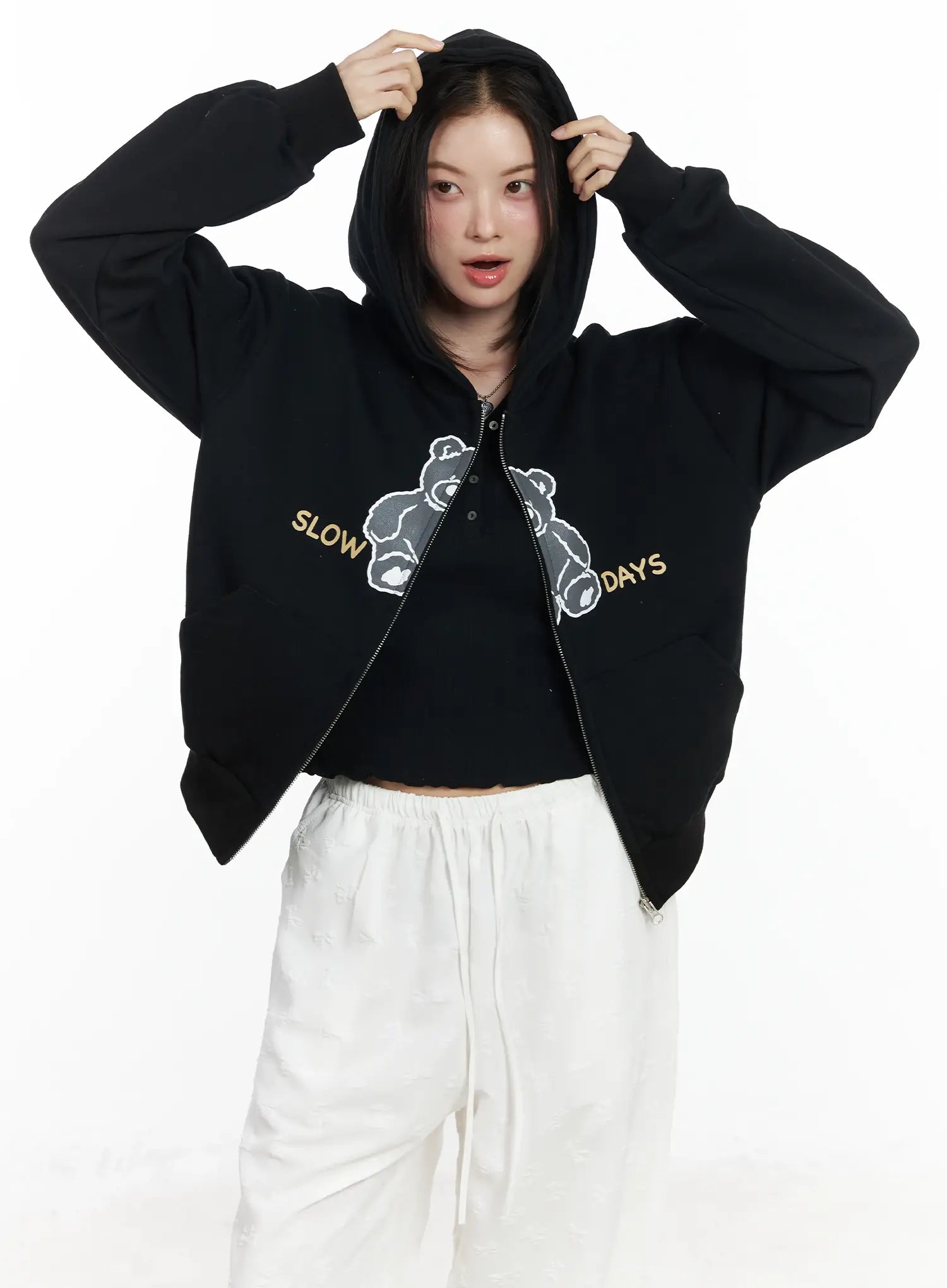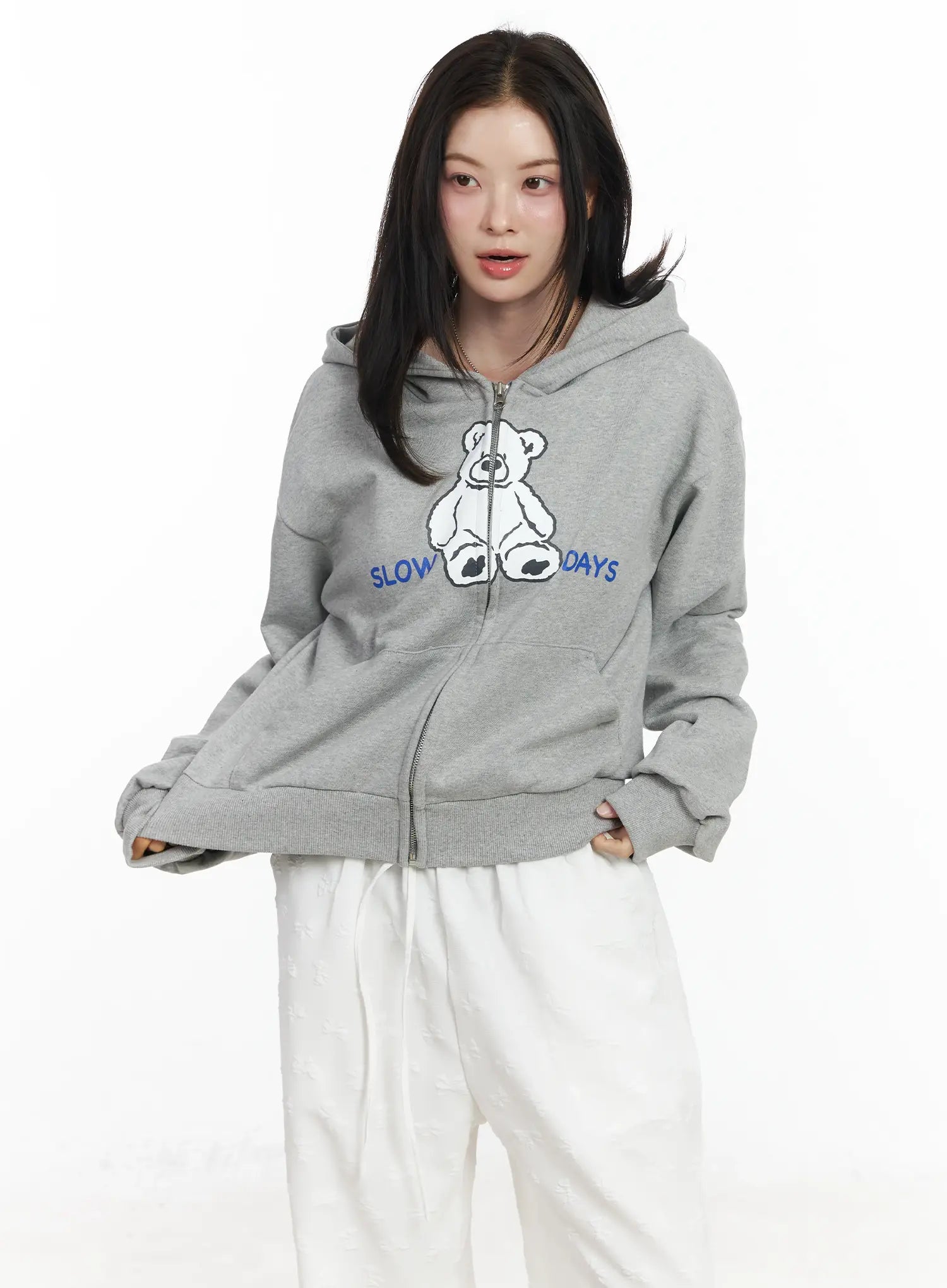 Teddy Bear Graphic Two-Way Zip-Up Hoodie IF525