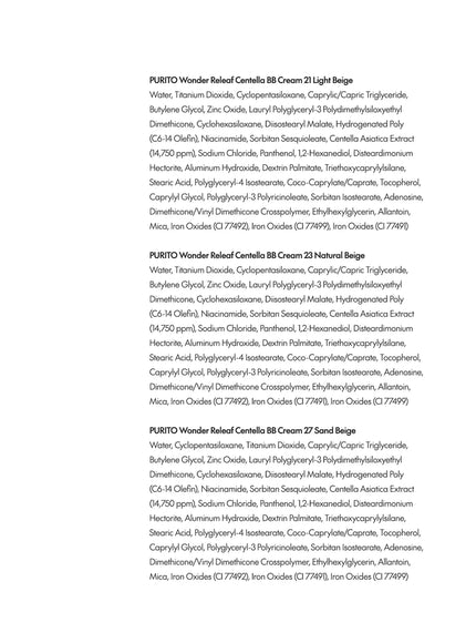 Water, Titanium Dioxide, Cyclopentasiloxane, Caprylic/Capric Triglyceride, Butylene Glycol, Zinc Oxide, Lauryl Polyglyceryl-3 Polydimethylsiloxyethyl Dimethicone, Cyclohexasiloxane, Diisostearyl Malate, Hydrogenated Poly (C6-14 Olefin), Niacinamide, Sorbitan Sesquioleate, Centella Asiatica Extract (14,750 ppm), Sodium Chloride, Panthenol, 1,2-Hexanediol, Disteardimonium Hectorite, Aluminum Hydroxide, Dextrin Palmitate, Triethoxycaprylylsilane, Stearic Acid, Polyglyceryl-4 Isostearate, Coco-Caprylate/Caprate, Tocopherol, Caprylyl Glycol, Polyglyceryl-3 Polyricinoleate, Sorbitan Isostearate, Adenosine, Dimethicone/Vinyl Dimethicone Crosspolymer, Ethylhexylglycerin, Allantoin, Mica, Iron Oxides (CI 77492), Iron Oxides (CI 77499), Iron Oxides (CI 77491)