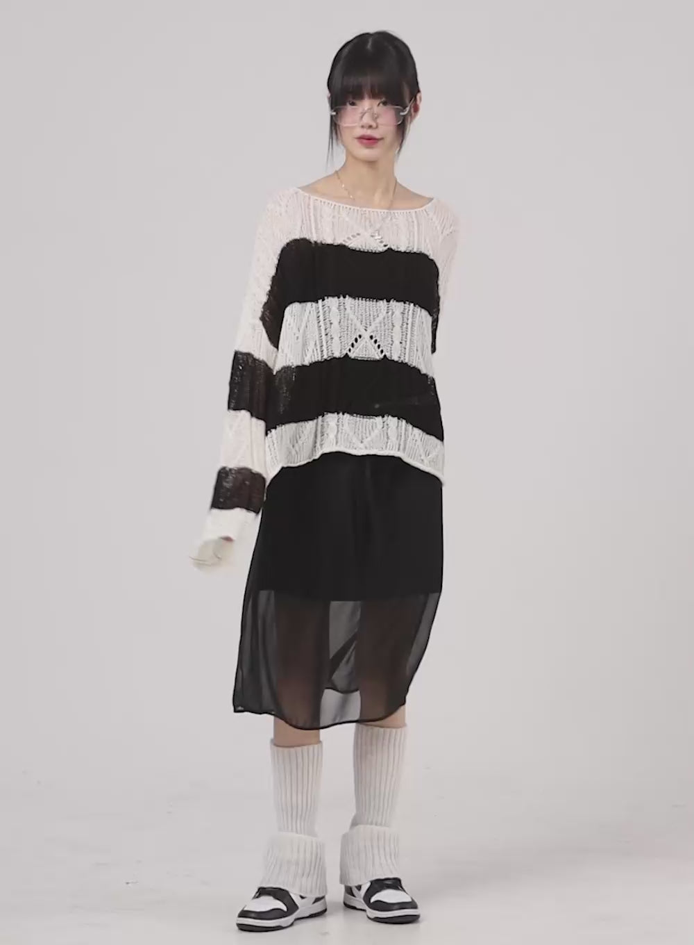 Wool Blend Hollow Out Striped Knit Sweater CM415