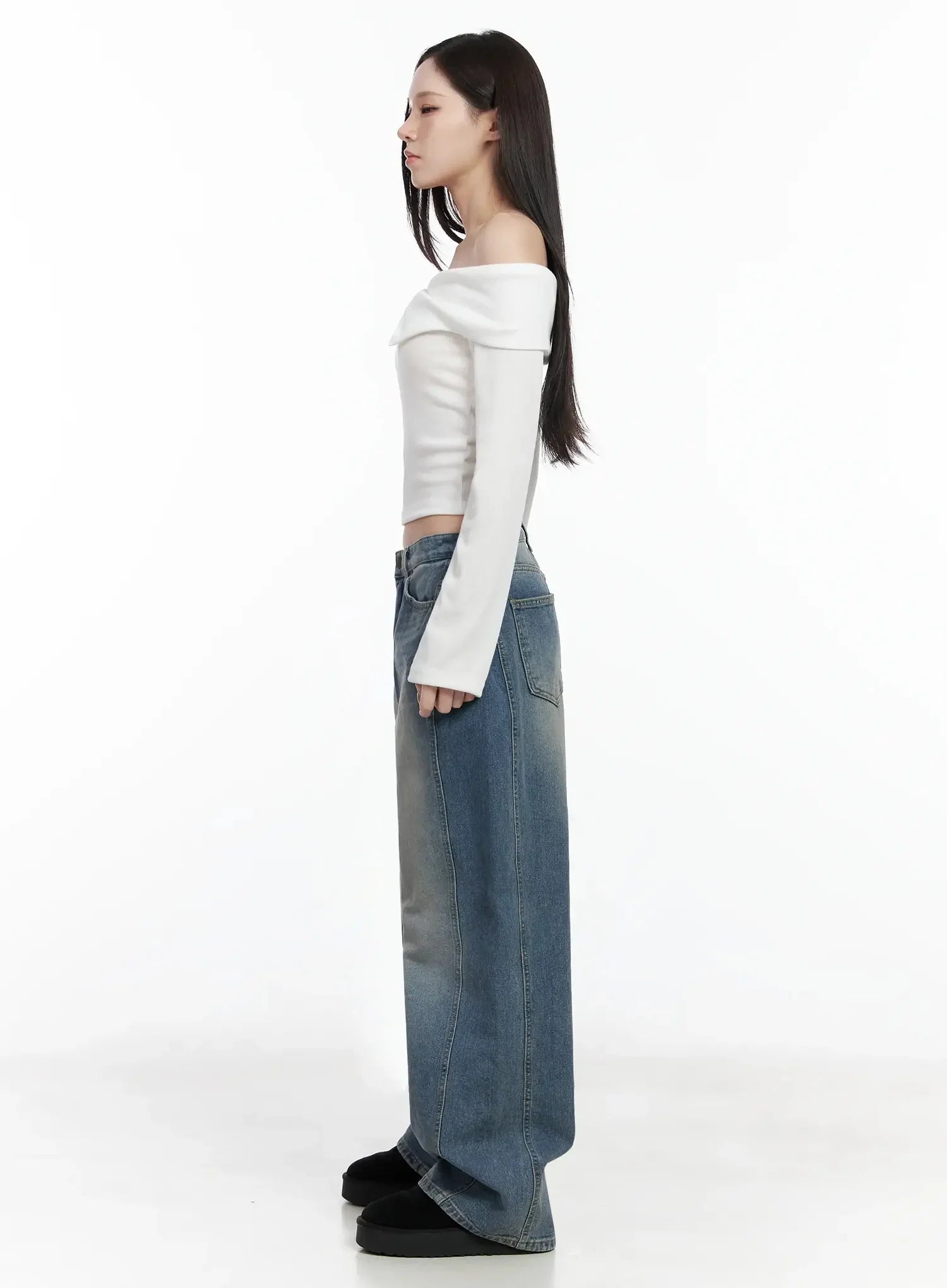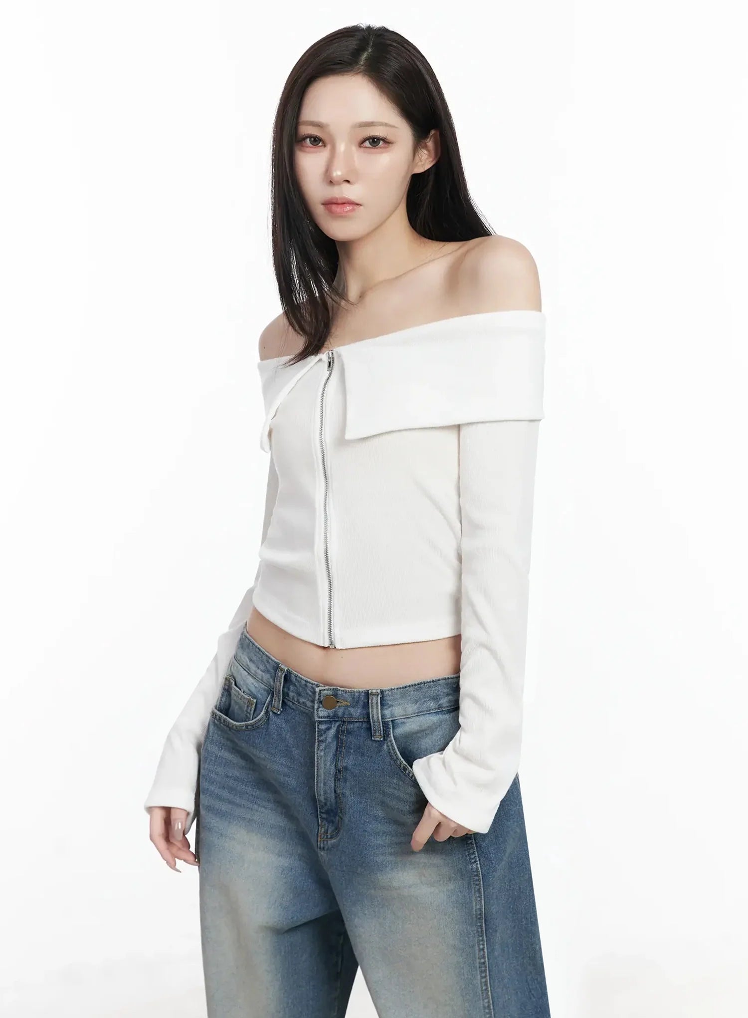 Ribbed Off-Shoulder Zip-Up Tee IJ528