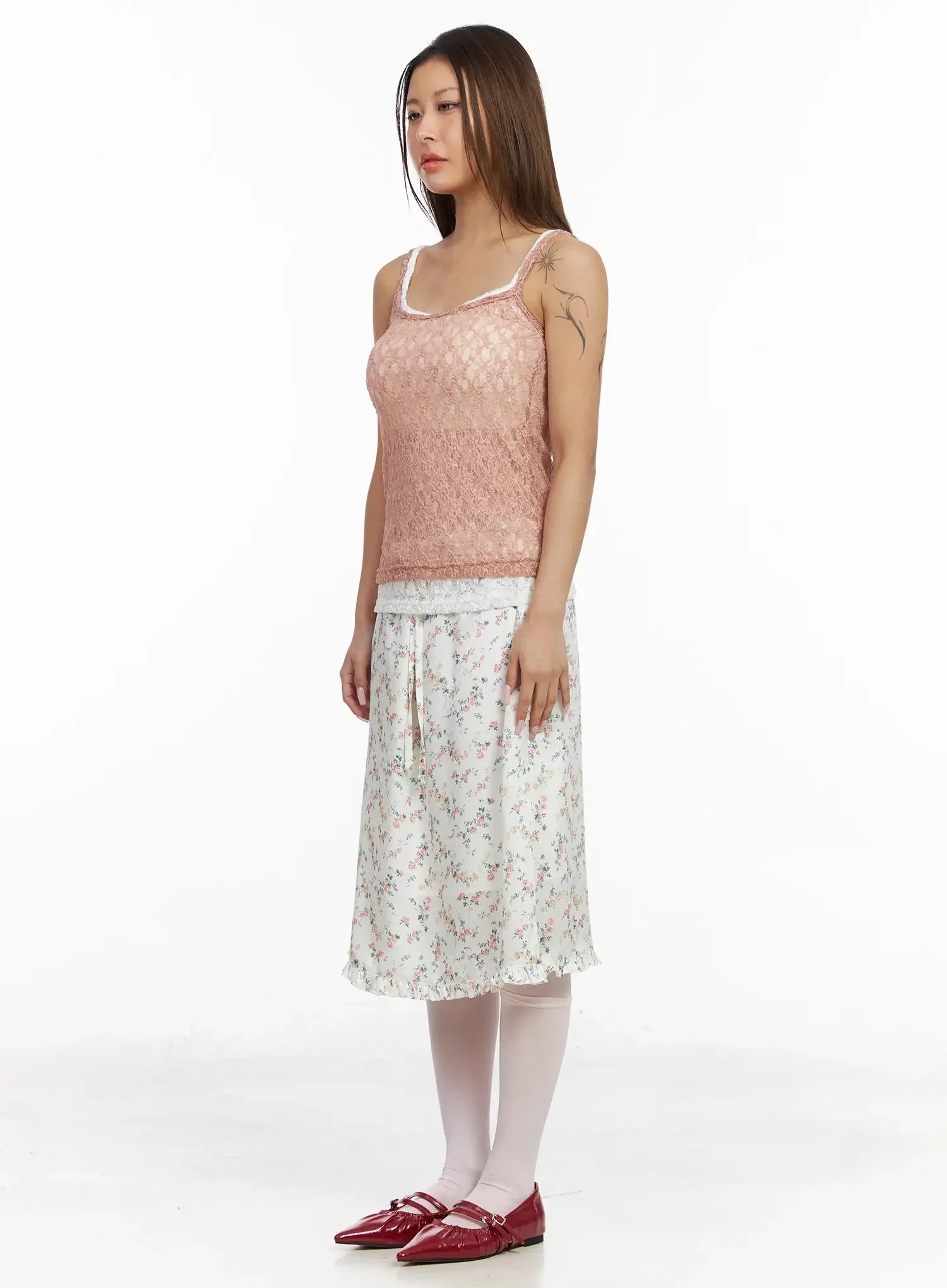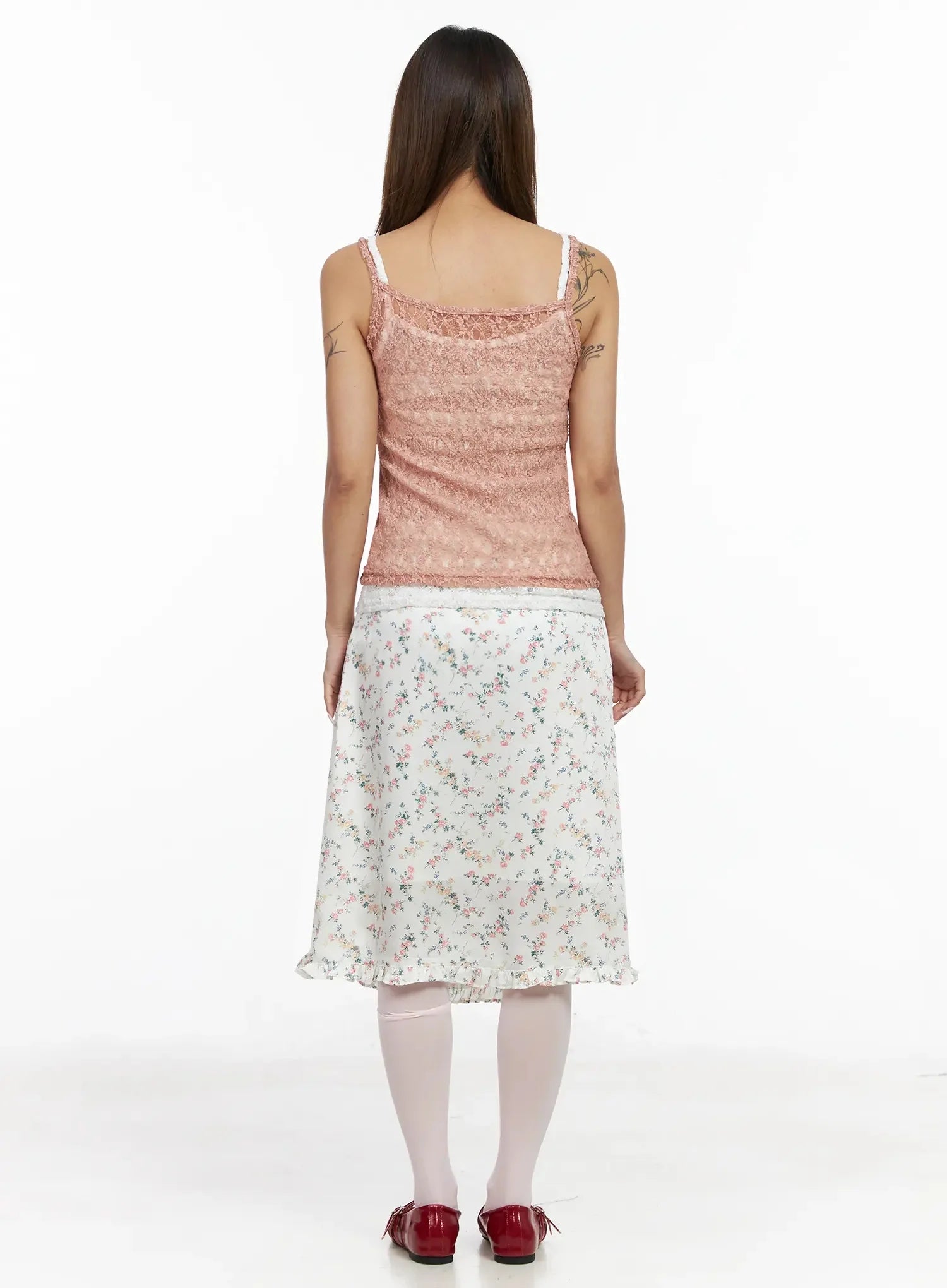 Floral Satin Ruffle Hem Midi Skirt IA527