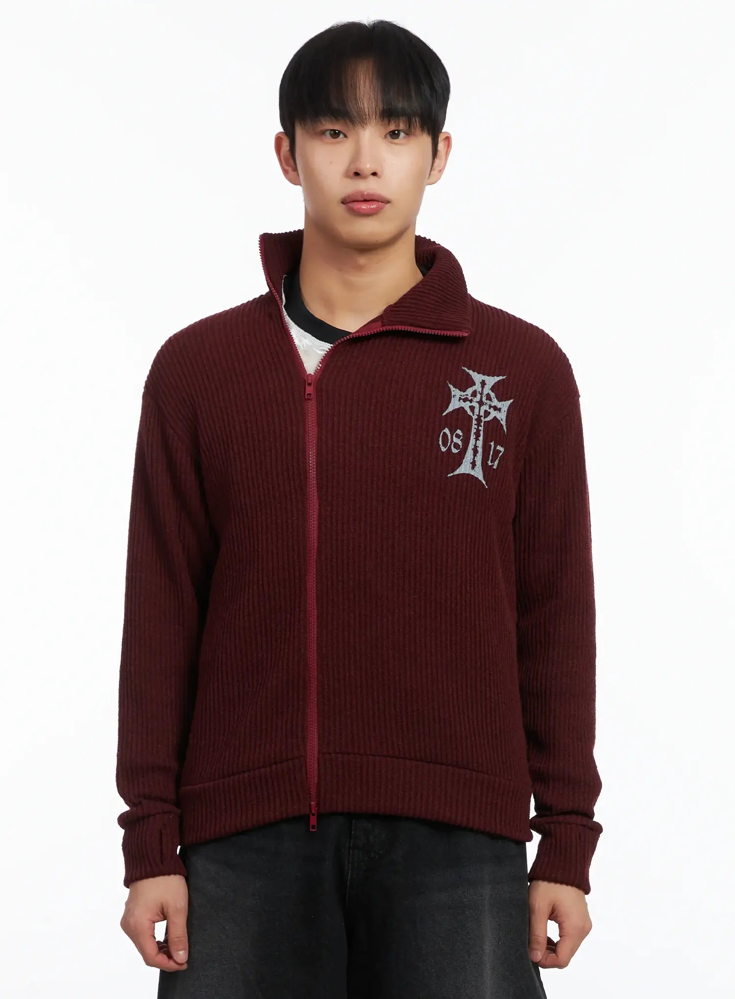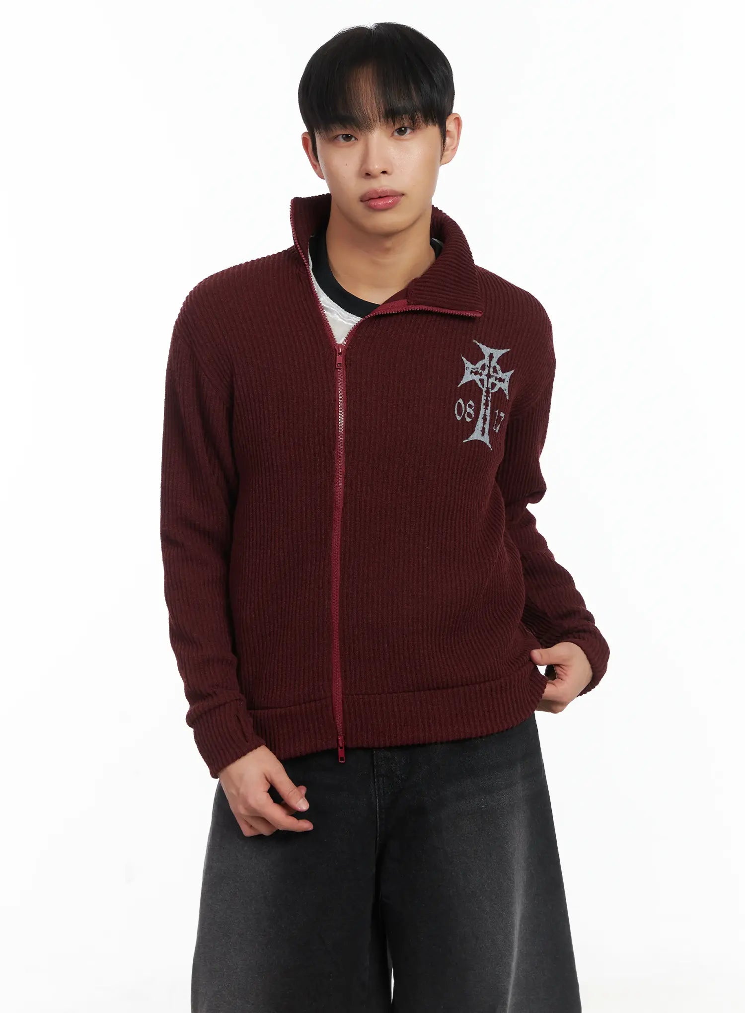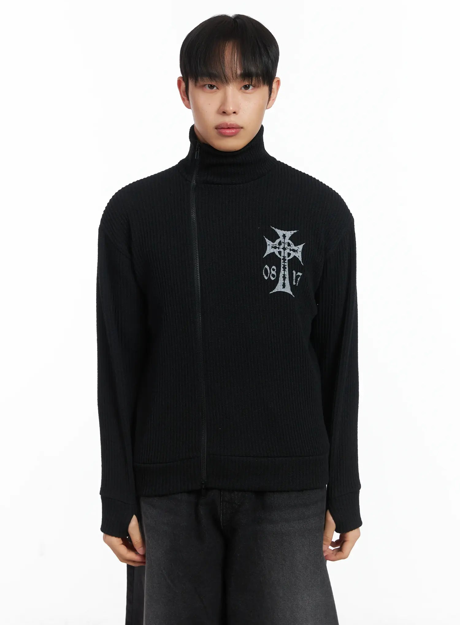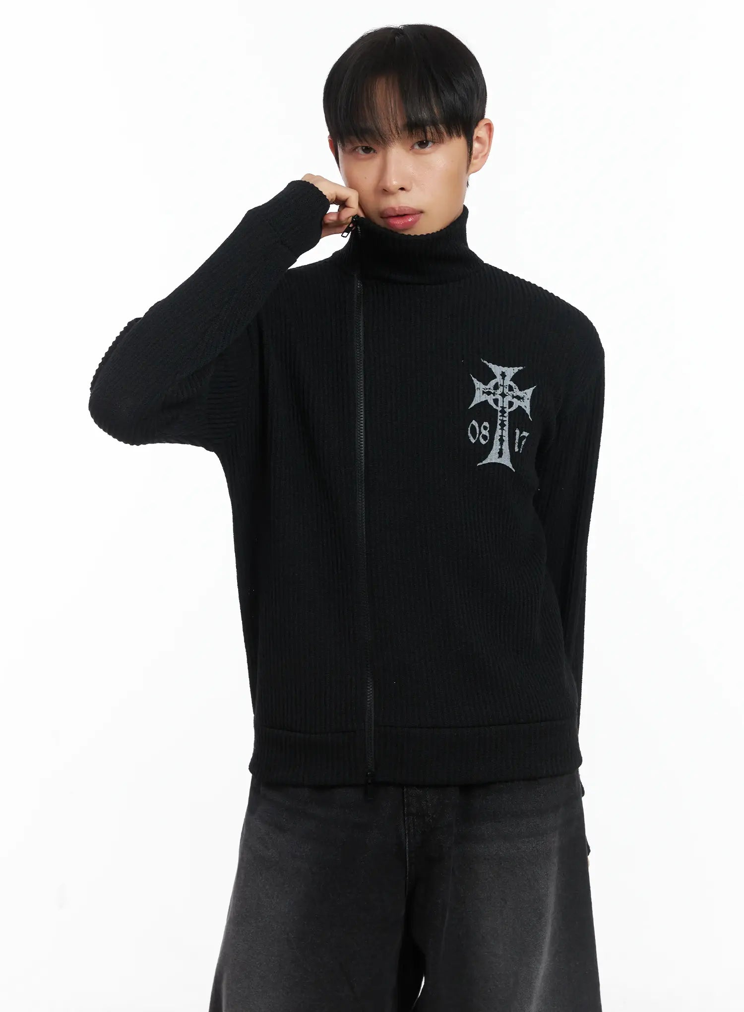 Cross Print High Neck Zip-Up Cardigan ID515