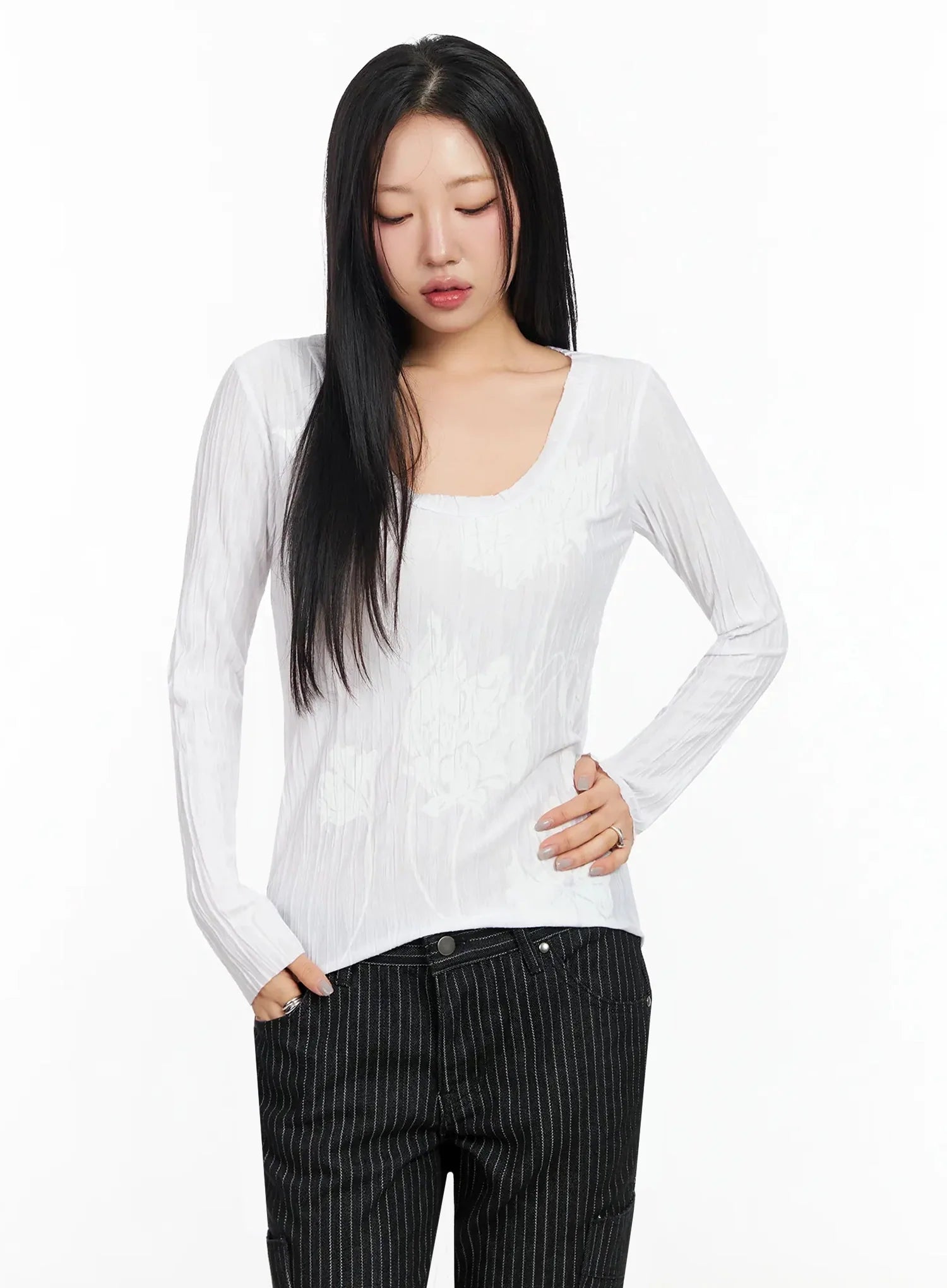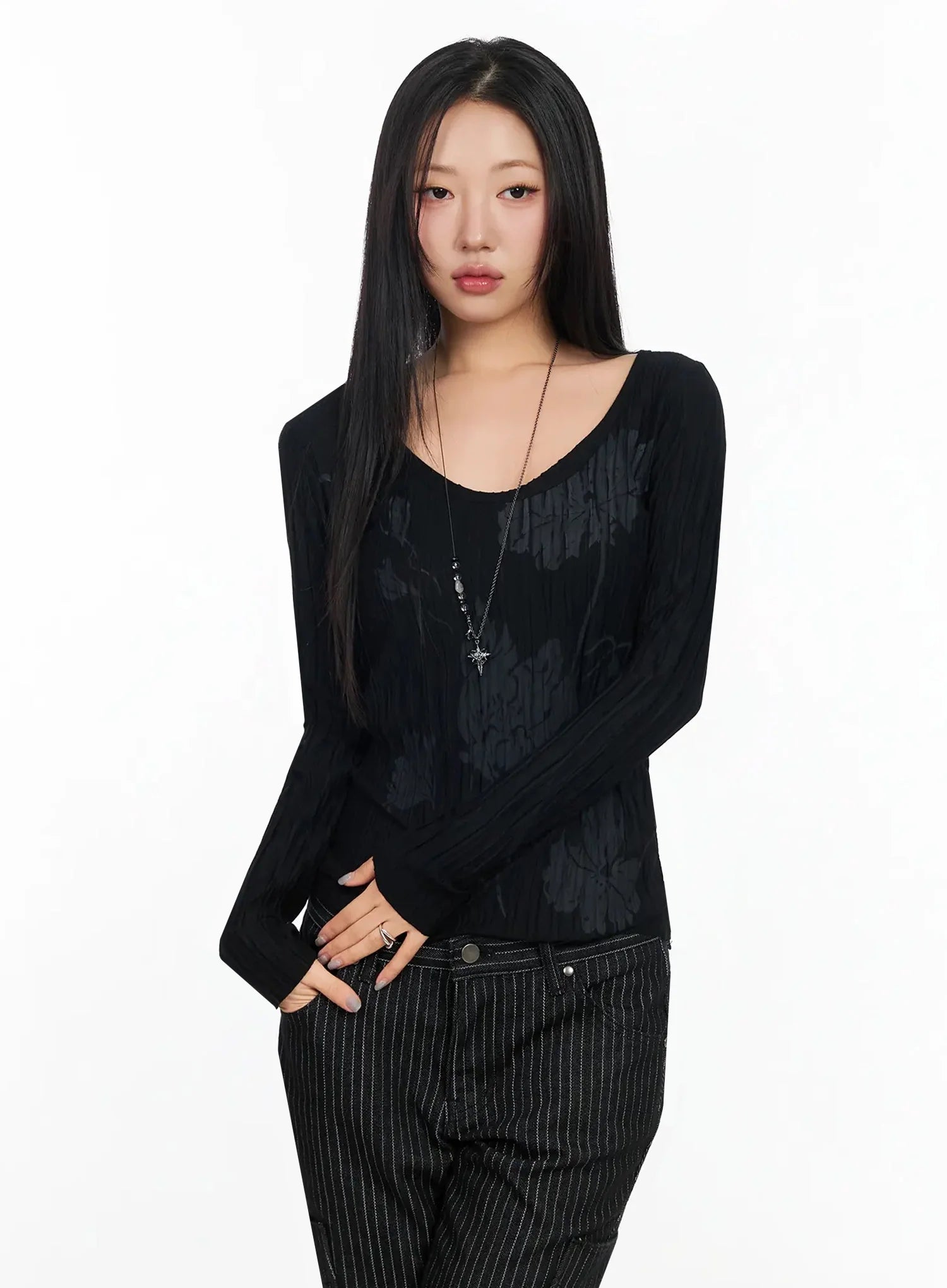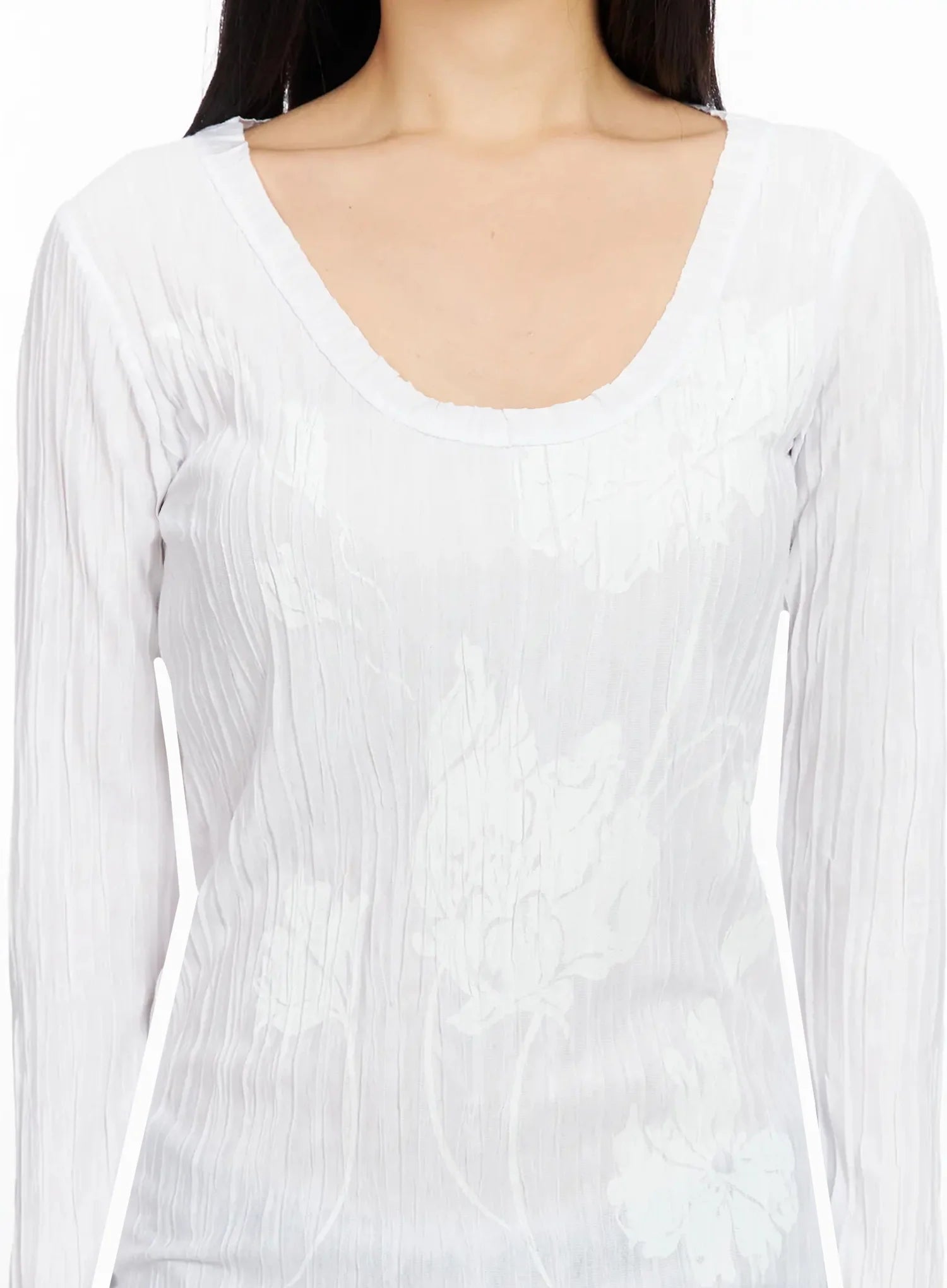 Floral Pleated U-Neck Long Sleeve CA513