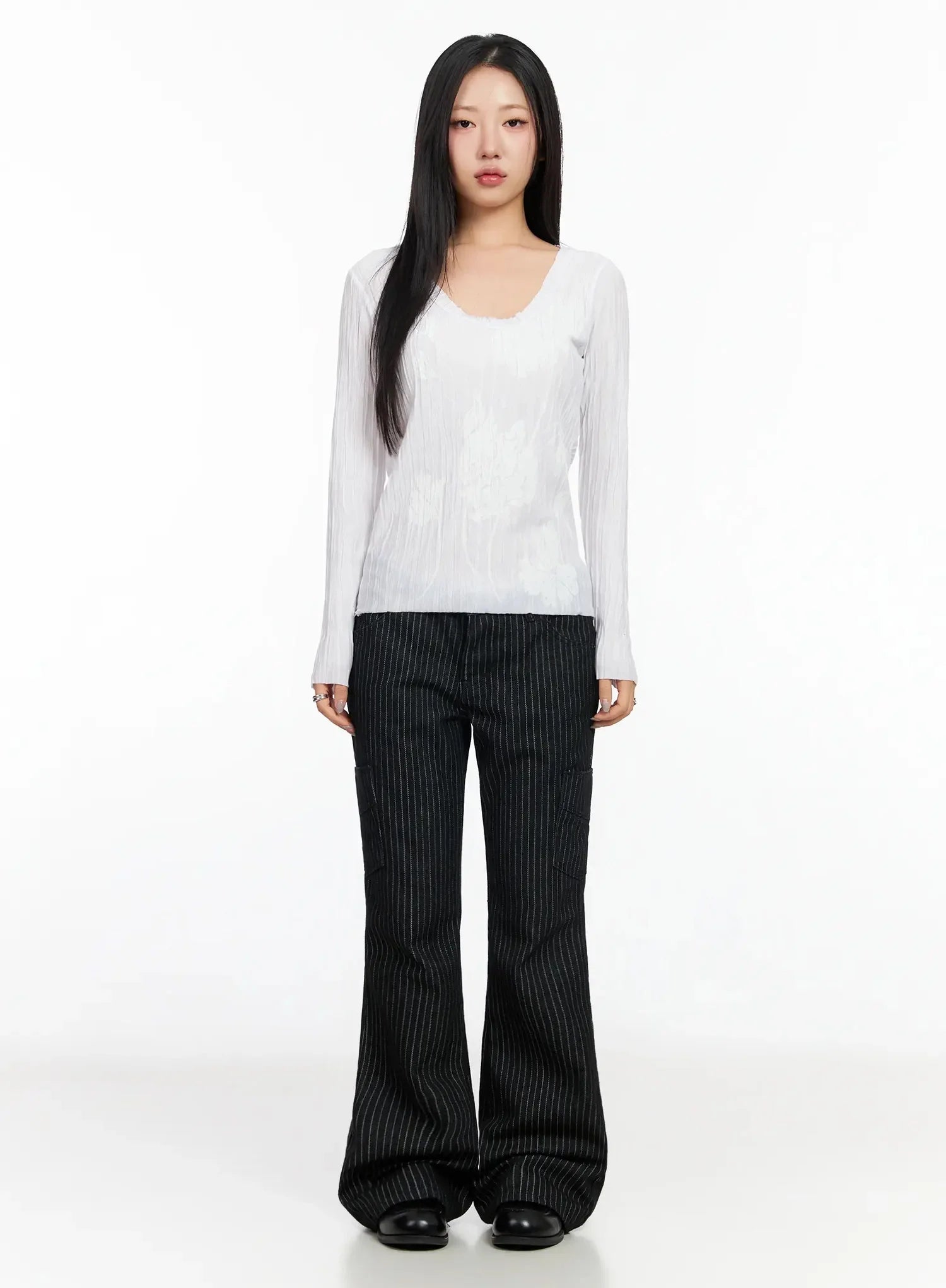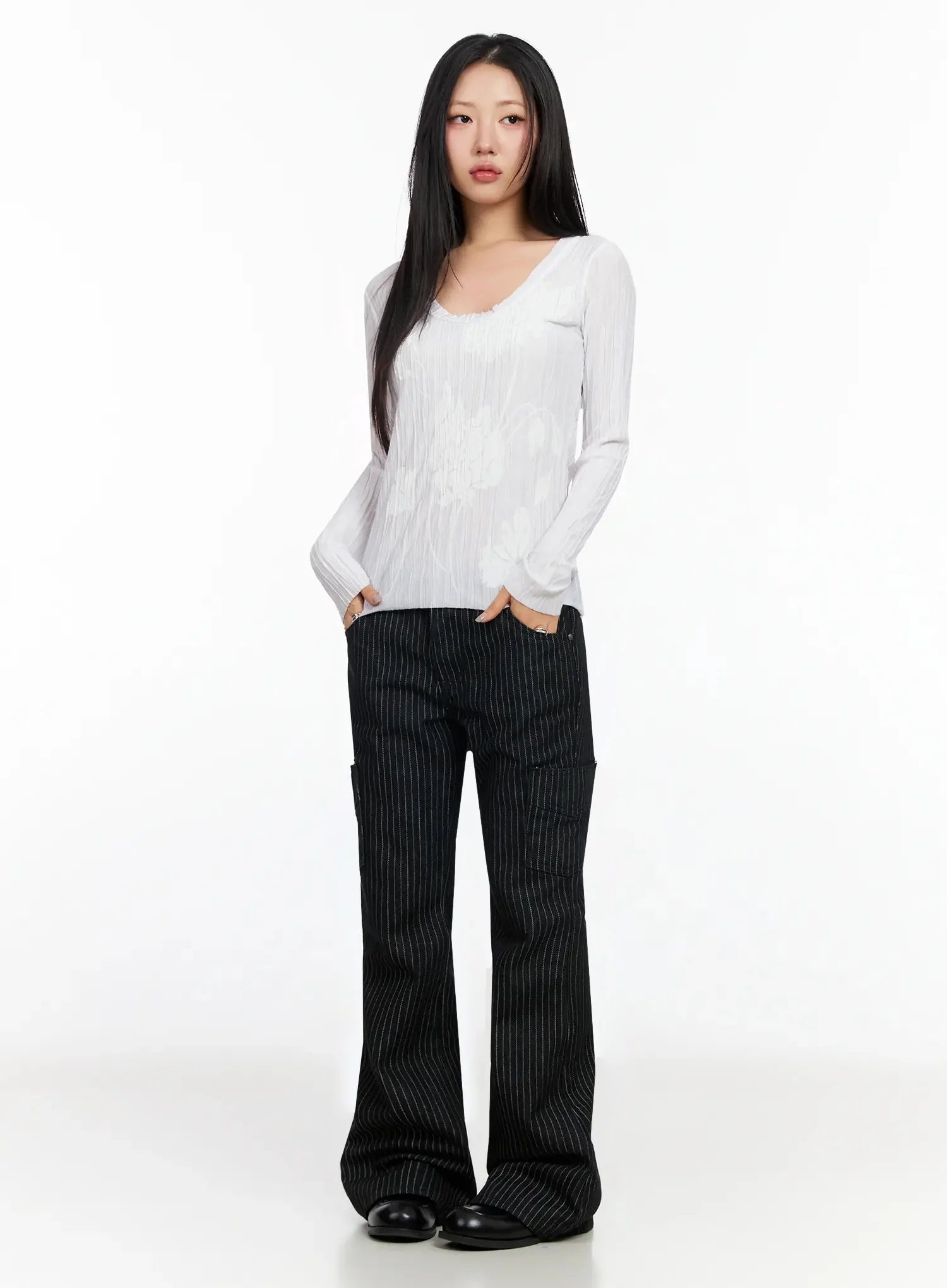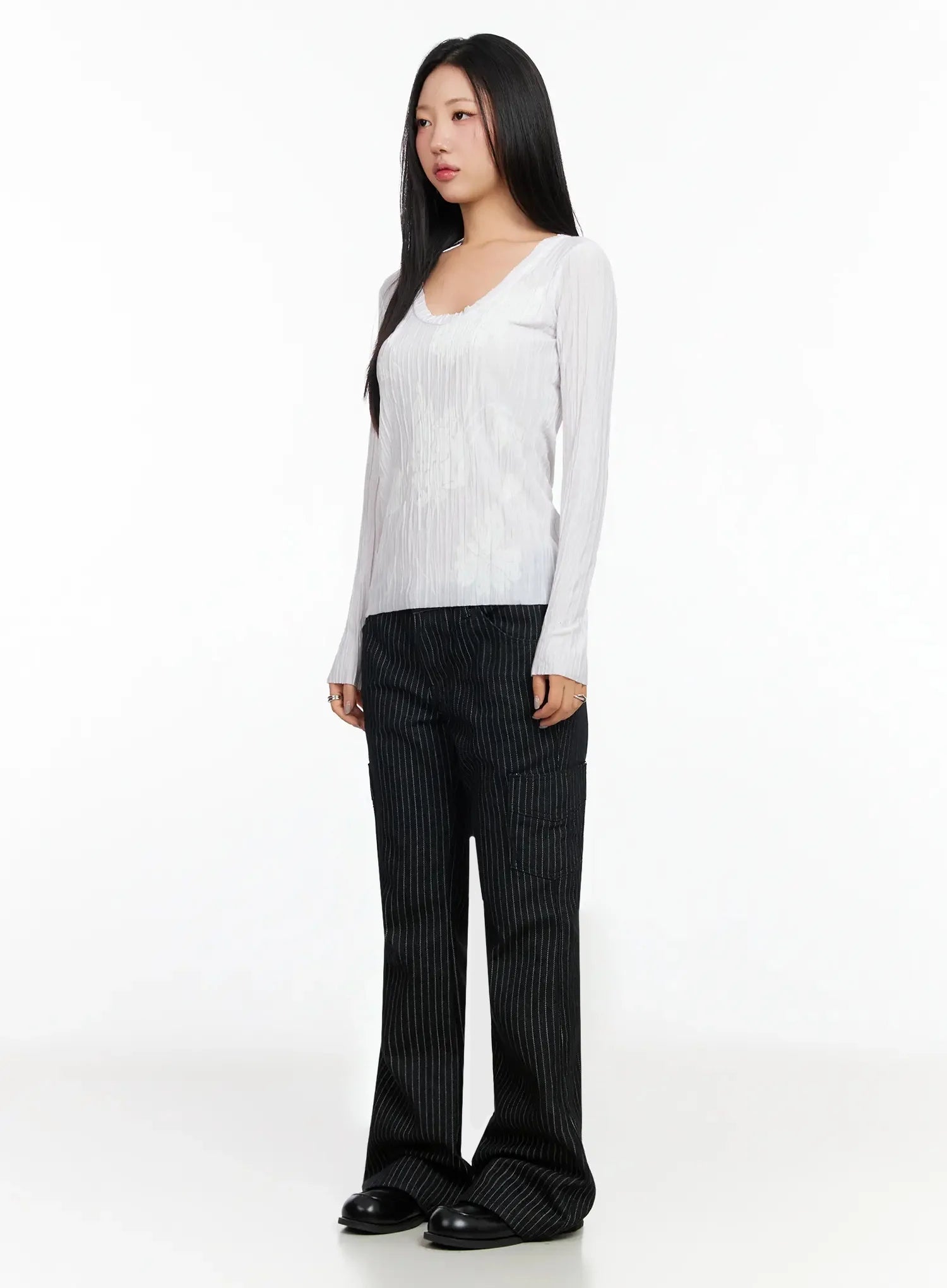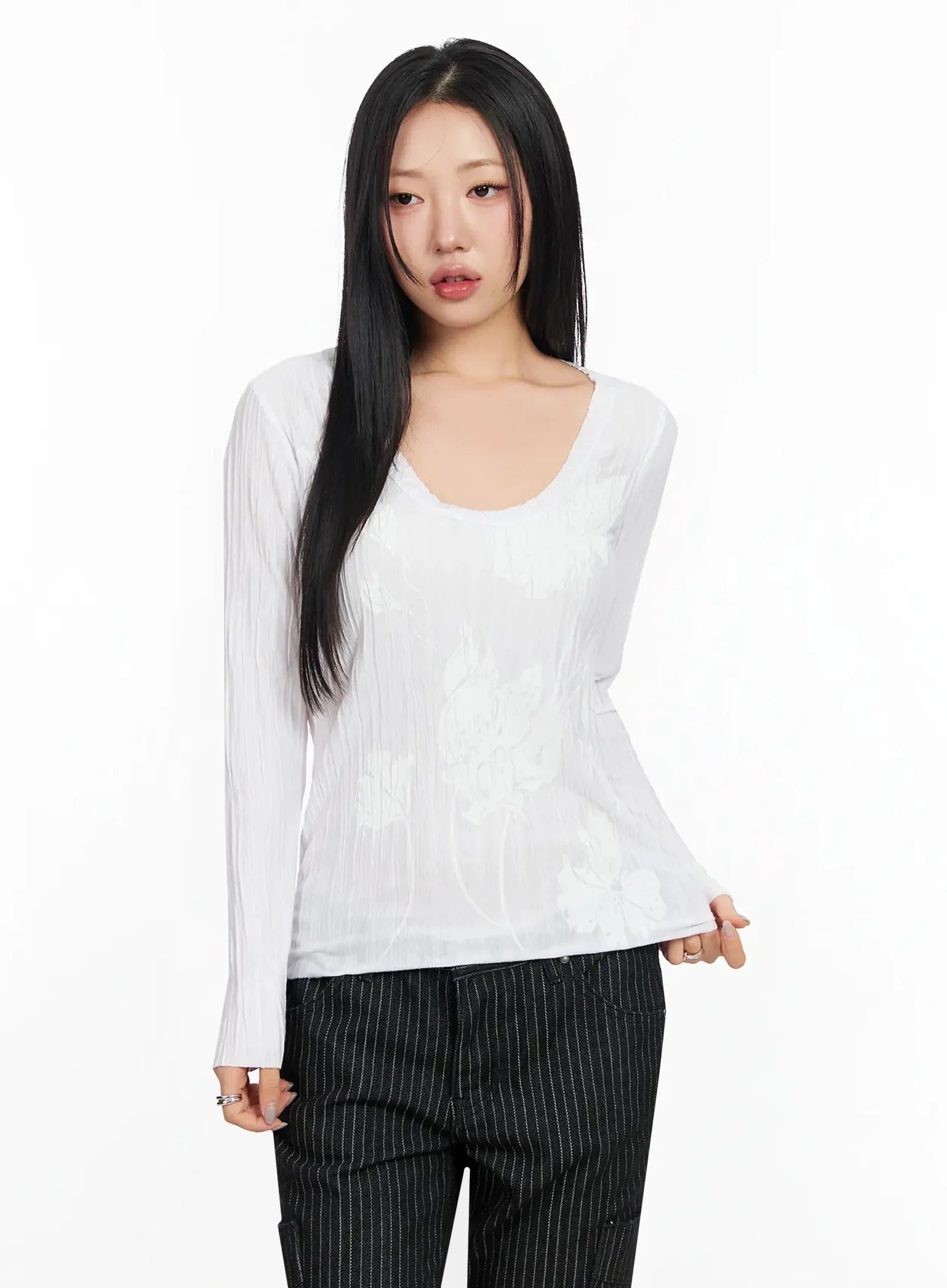 Floral Pleated U-Neck Long Sleeve CA513
